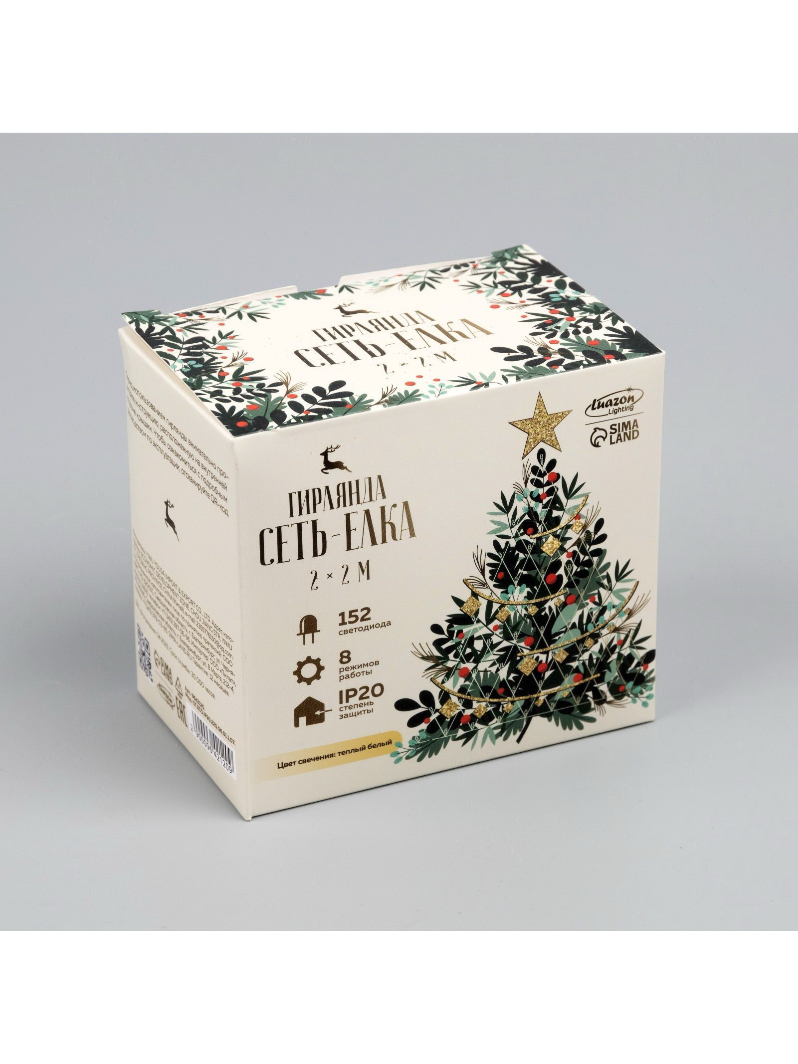 Гирлянда "Сеть-ёлка" 2 x 2 м, IP20, тёмная нить, 152 LED, свечение тёплое белое, 8 режимов, 220 В, 6.5x12x6.5 см., Luazon Lighting, Китай