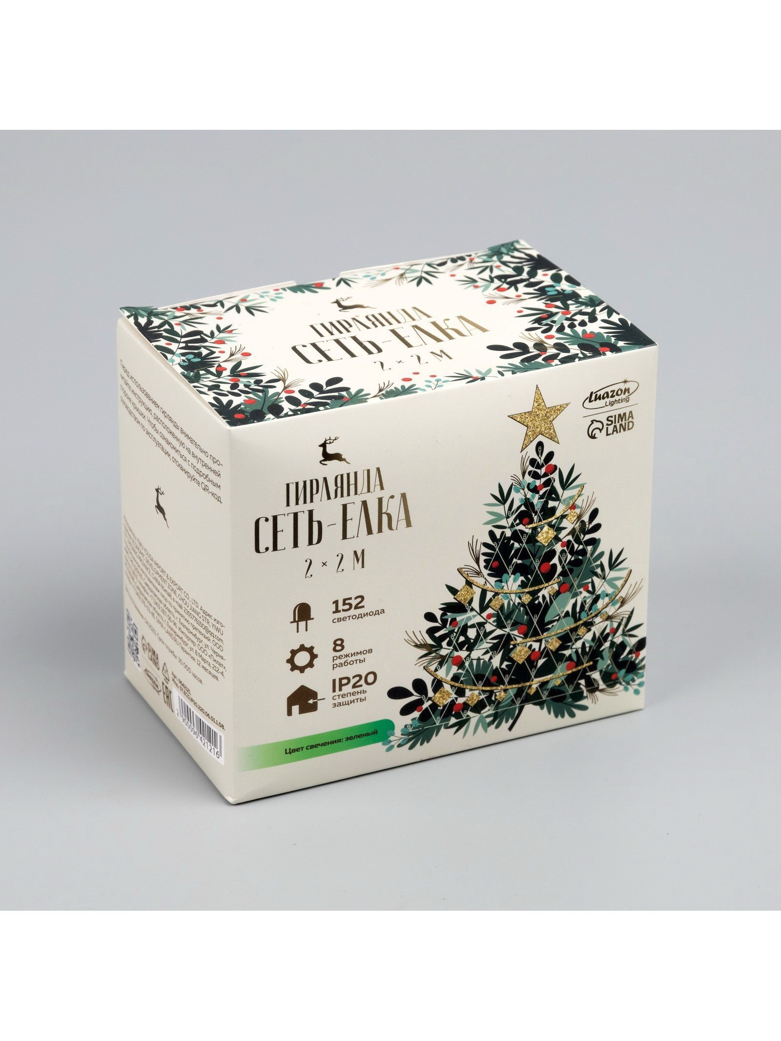 Гирлянда "Сеть-ёлка" 2x2 м, IP20, прозрачная нить, 152 LED, свечение зелёное, 8 режимов, 220 В, 6.5x12x6.5 см., Luazon Lighting, Китай