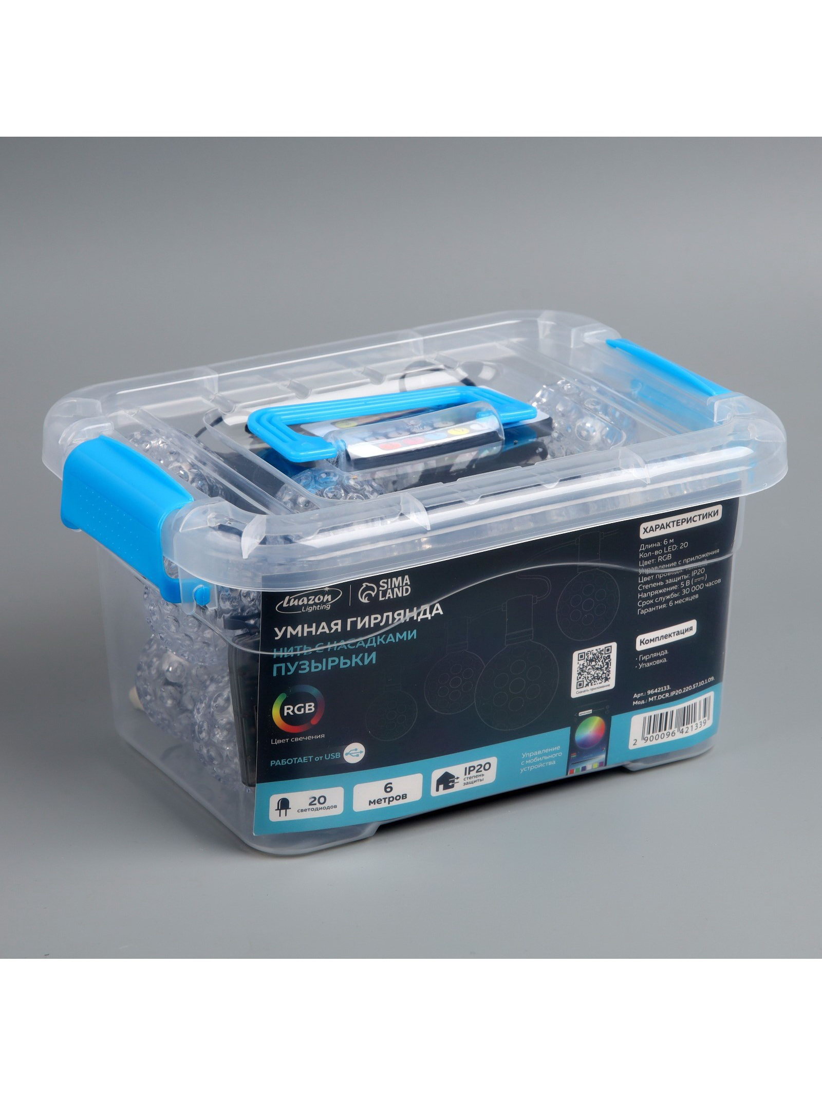 Умная гирлянда "Нить" 6 м с насадками "Пузырьки", IP20, тёмная нить, 20 LED, свечение RGB, USB, 19x25x13 см., Luazon Lighting, Китай