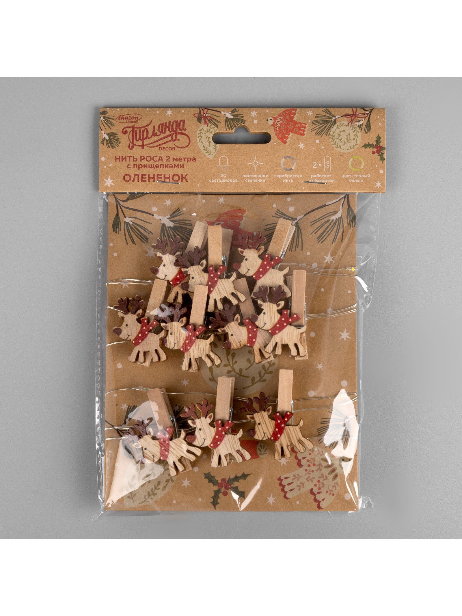 Гирлянда "Нить" 2 м, роса с насадками "Прищепки-оленёнок", IP20, серебристая нить, 20 LED, от батареек ААx2, свечение тёплое белое, Luazon Lighting, Китай