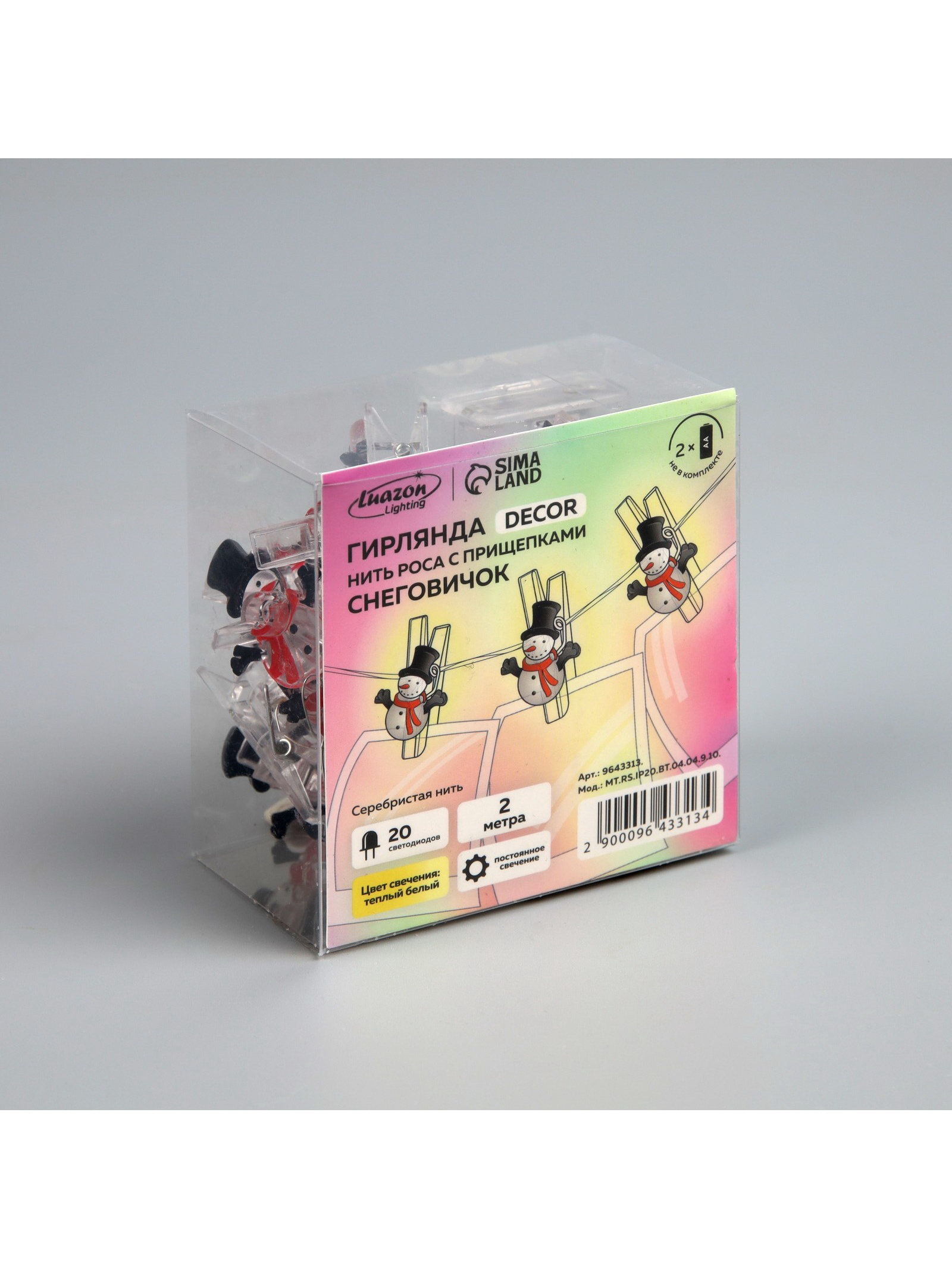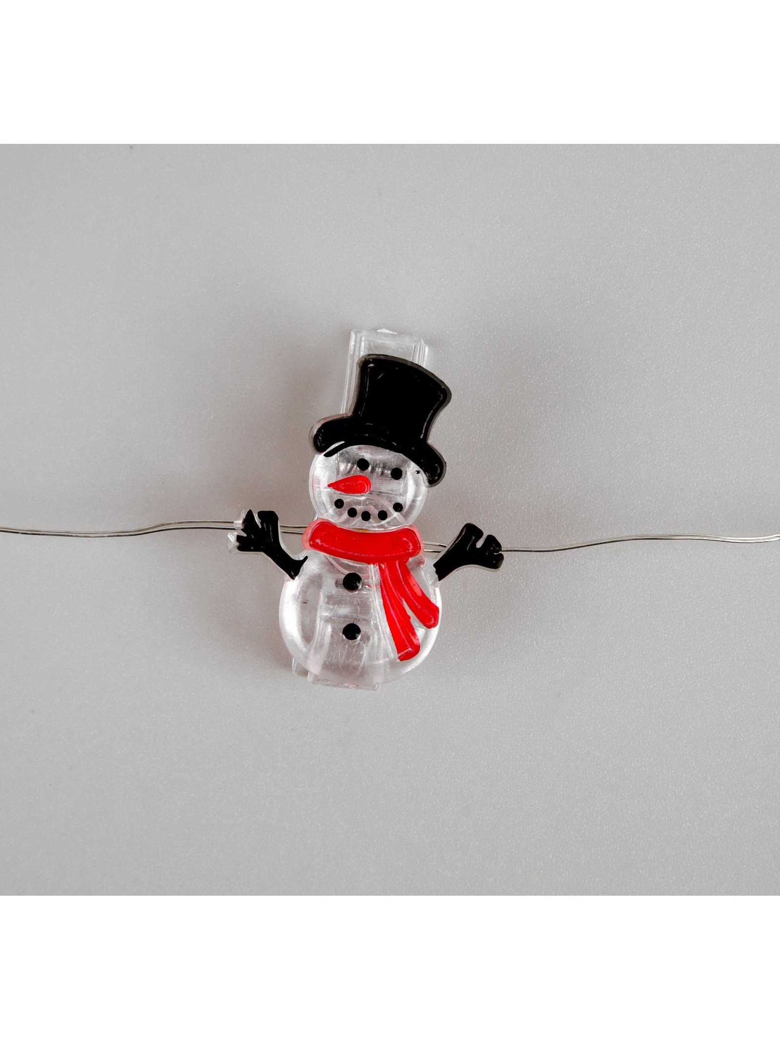 Гирлянда "Нить" 2 м, роса с насадками "Прищепки-снеговик", IP20, серебристая нить, 20 LED, от батареек ААx2, свечение тёплое белое, 5x8x3 см., Luazon Lighting, Китай