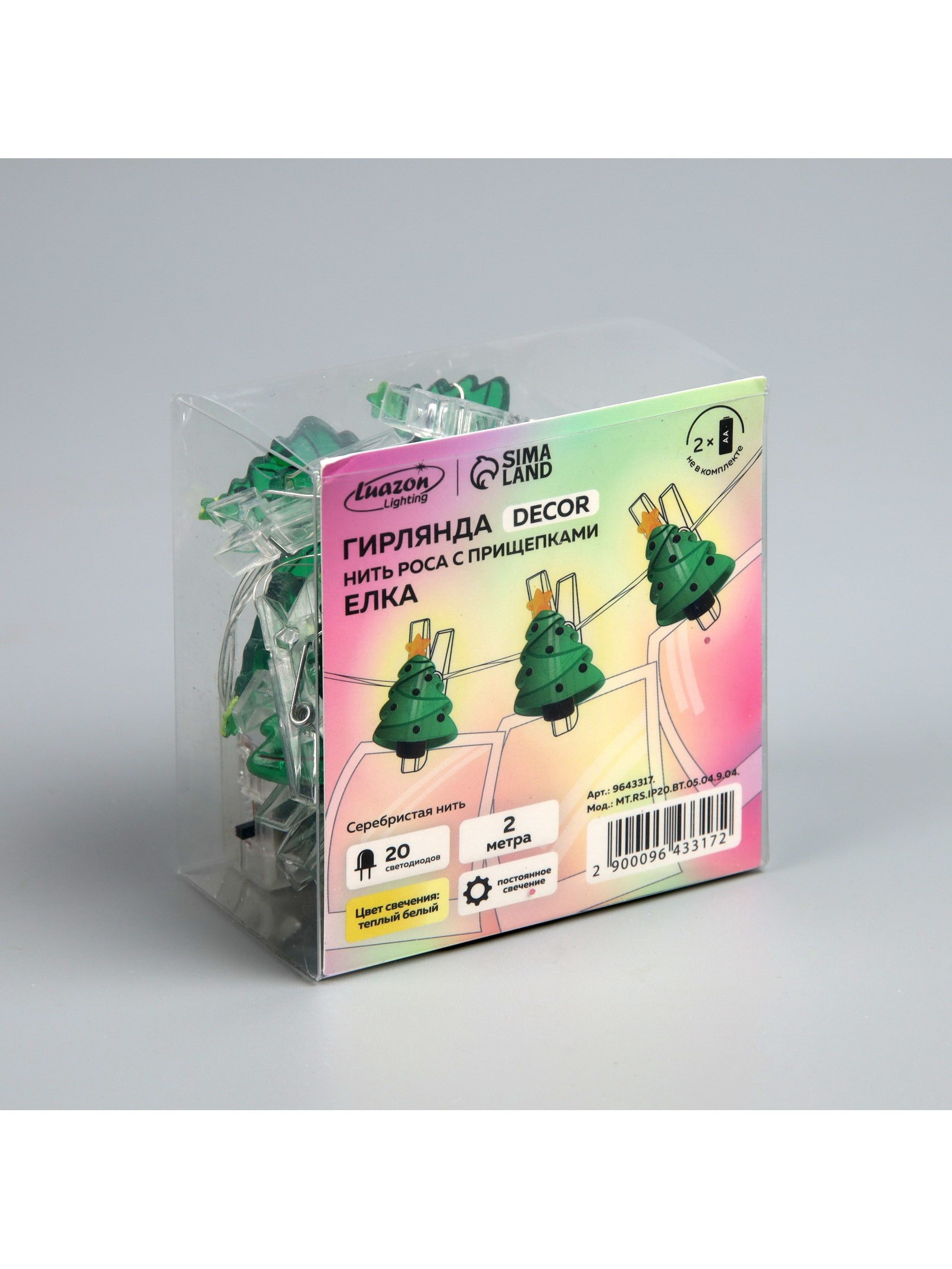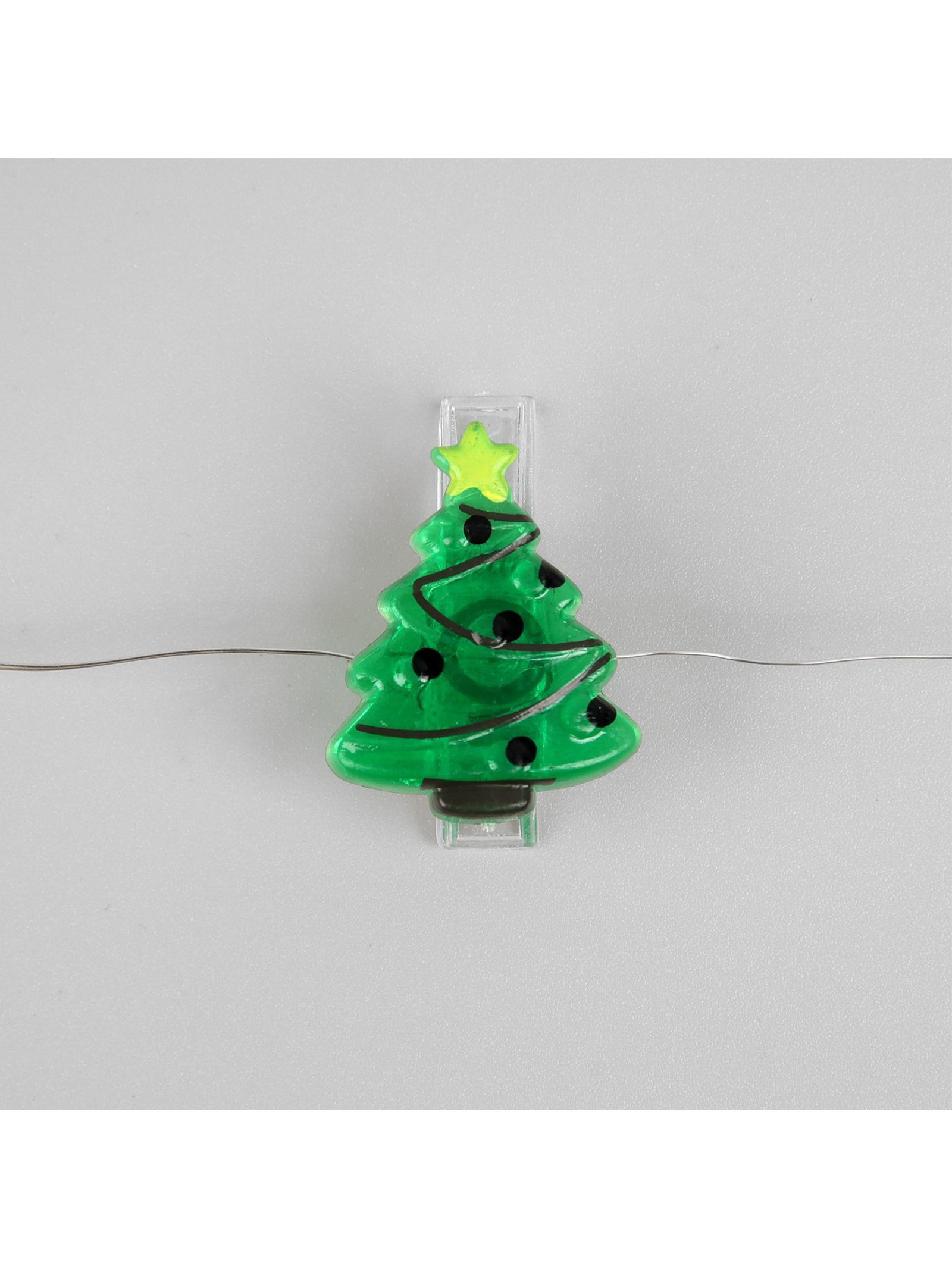 Гирлянда "Нить" 2 м роса с насадками "Прищепки-ёлки", IP20, серебристая нить, 20 LED, батарейки ААх2, 5x8x3 см., Luazon Lighting, Китай