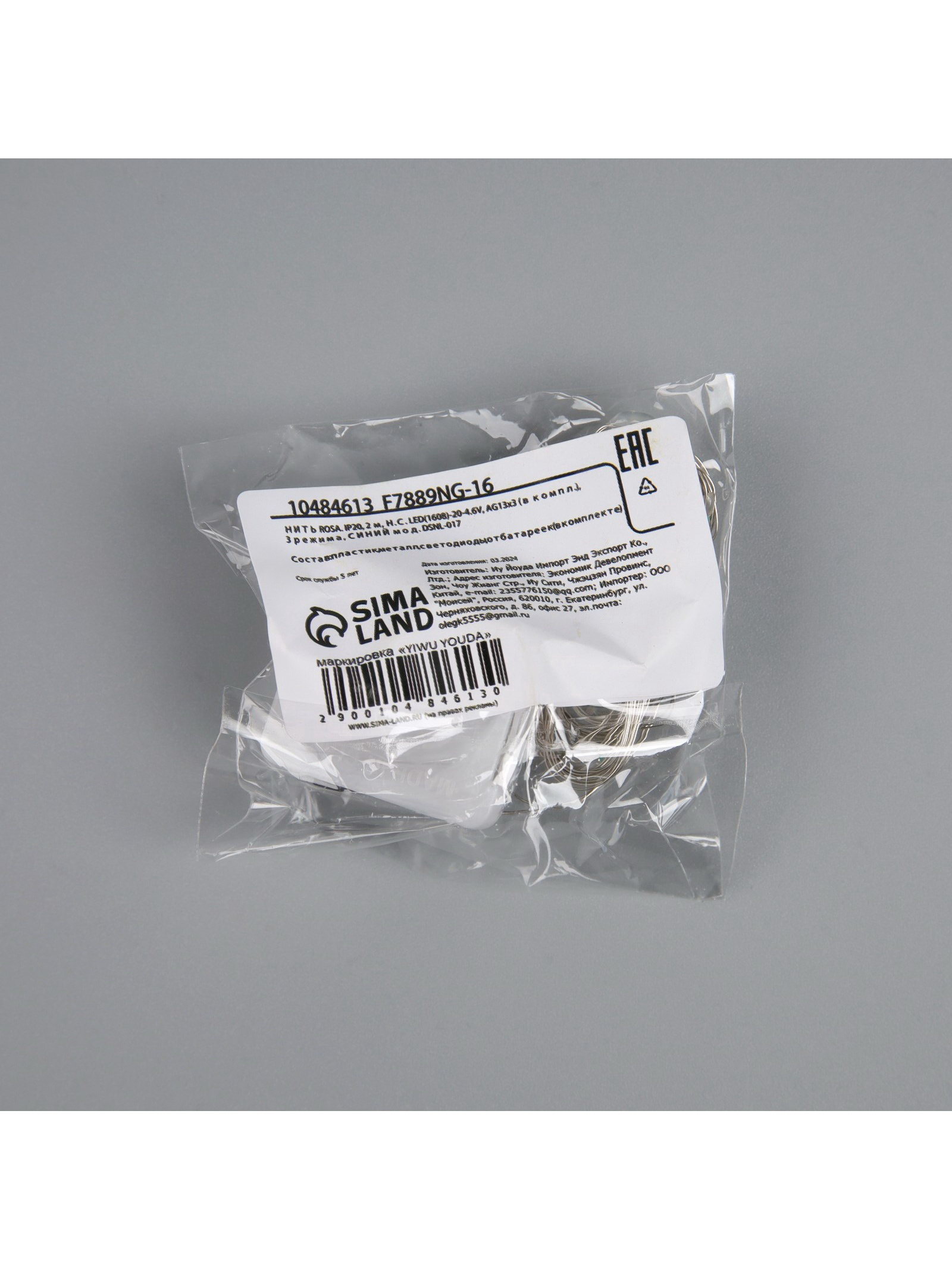 Размер упаковки: 4.5 x 2 x 5 см. Вид лампы: Светодиодная Вид гирлянды: Гирлянда-нить Применение: Внутреннее Режим работы: Задаётся контроллером Материал нити: Лаковое покрытие Необходимая комплектация: Не нужна Степень защиты: IP20 Температурный режим: От +5 до +35 ℃ Количество режимов: 3 Количество ламп: 20 Наличие блока питания: Нет Насадки: Нет Длина, м: 2 Тип подключения: Батарейки Цвет свечения: Синий Цвет нити гирлянды: Серебристый Тип питания: От батареек Типоразмер батареек: LR44 (V13GA, AG13, LR1154, SR44) tnved: 9405310000