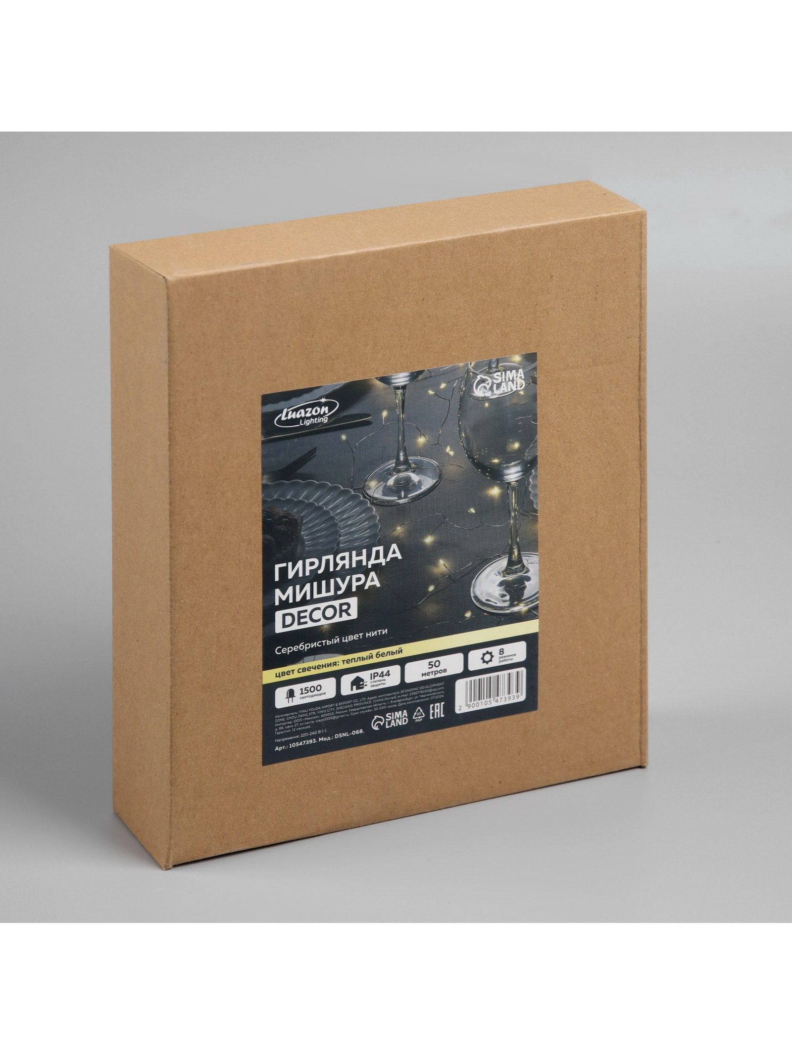 Гирлянда "Мишура" 50 м роса, IP44, серебристая нить, 1500 LED, 8 режимов, свечение тёплое белое, 36 В, 15x10x5 см., Luazon Lighting, Китай