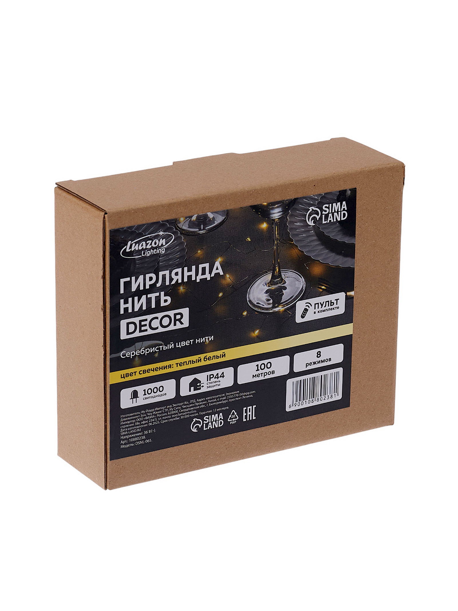 Гирлянда "Нить" 100 м роса, IP44, серебристая нить, 1000 LED, пульт, 36 В, свечение тёплое белое, 7x16x10 см., Luazon Lighting, Китай