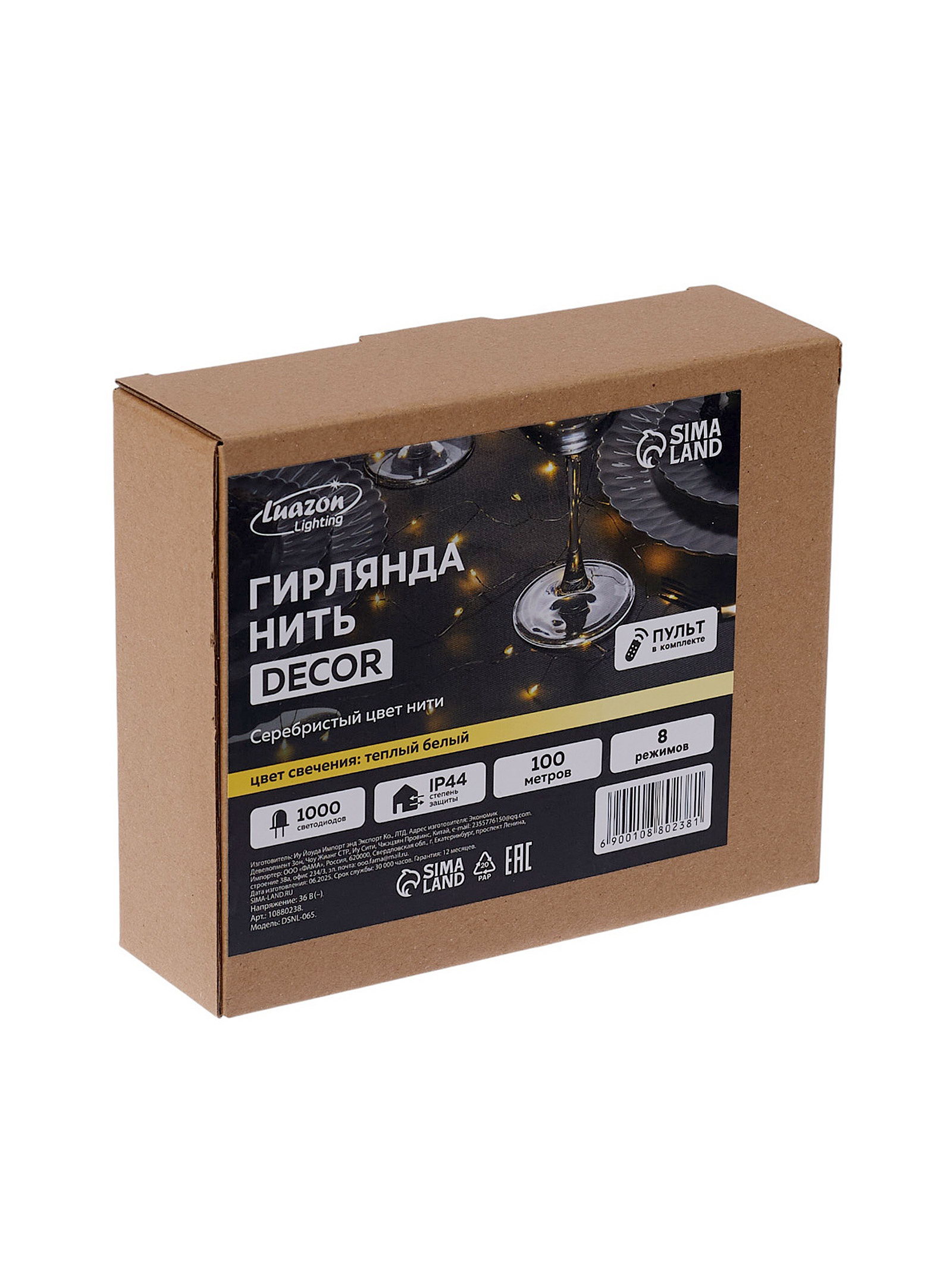 Гирлянда "Нить" 100 м, роса, IP44, серебристая нить, 1000 LED, пульт, 36 В, свечение тёплое белое, 7x16x10 см., Luazon Lighting, Китай