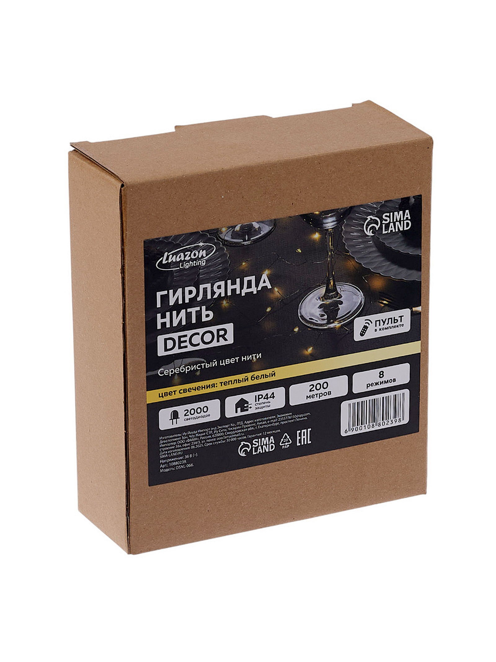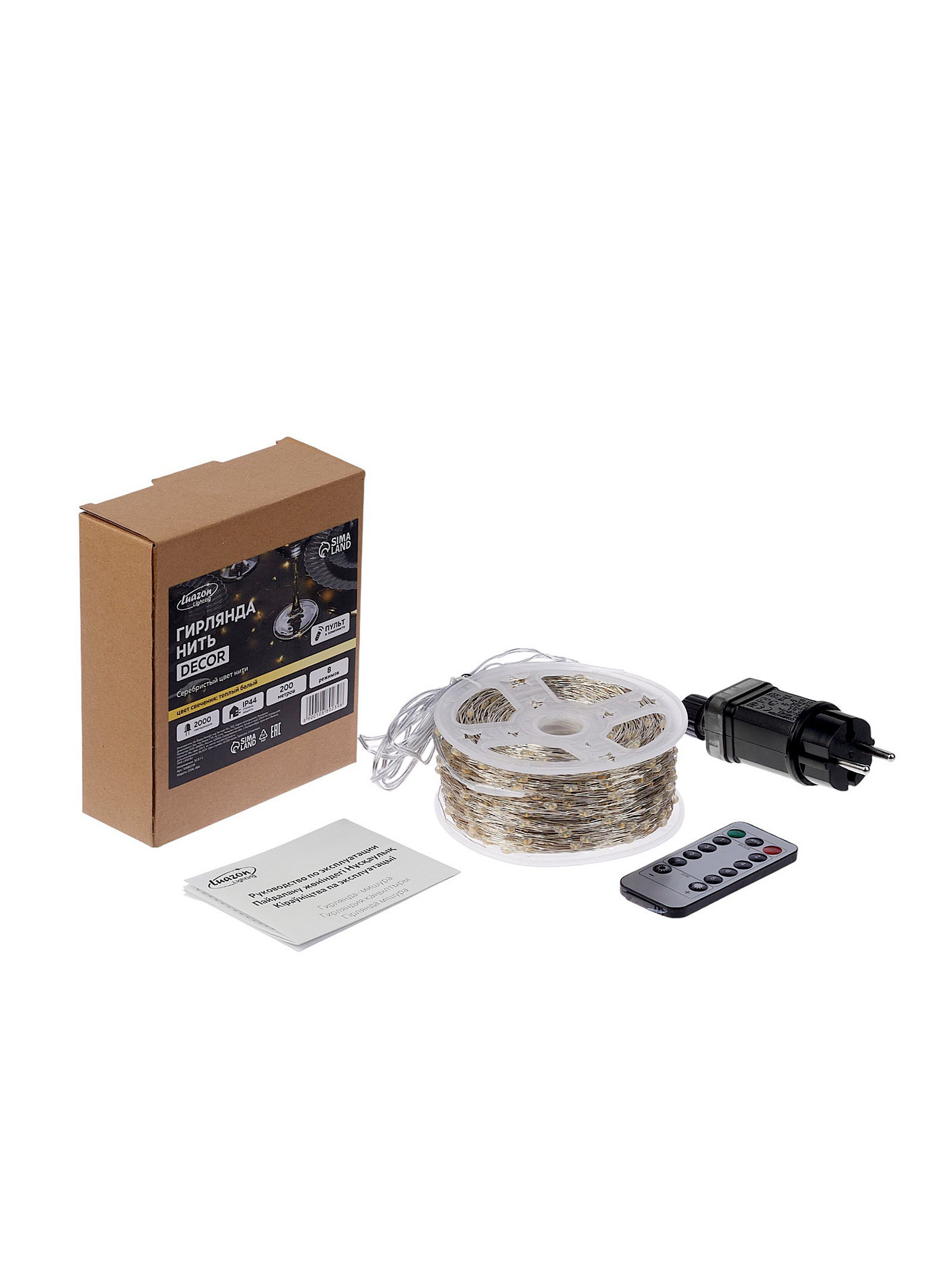 Гирлянда "Нить" 200 м роса, IP44, серебристая нить, 2000 LED, пульт, 36 В, свечение тёплое белое, 7x16x14 см., Luazon Lighting, Китай