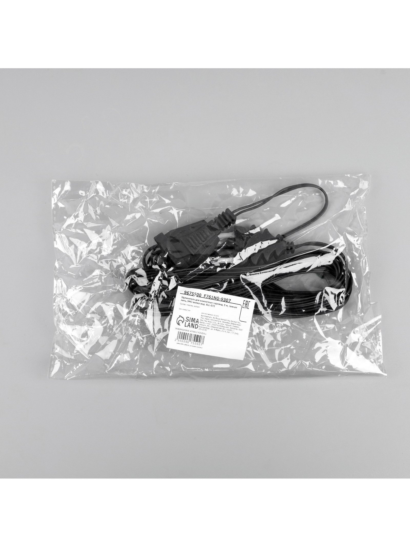 Удлинитель для комнатных гирлянд, 5 м, тёмная нить, УМС-вилка, 3x10x3 см., Luazon Lighting, Китай