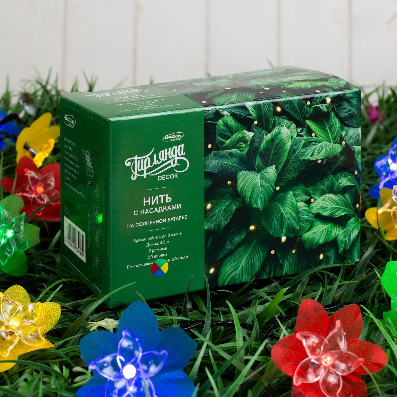 Гирлянда "Нить", 4.5 м, уличная, с насадками "Лилия", IP44, 30 LED, 2 режима, солнечная батарея, тёмная нить, свечение белое, Luazon Lighting, Китай