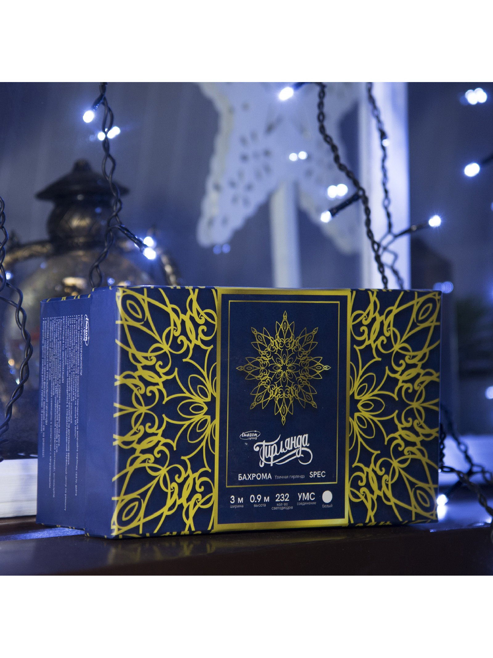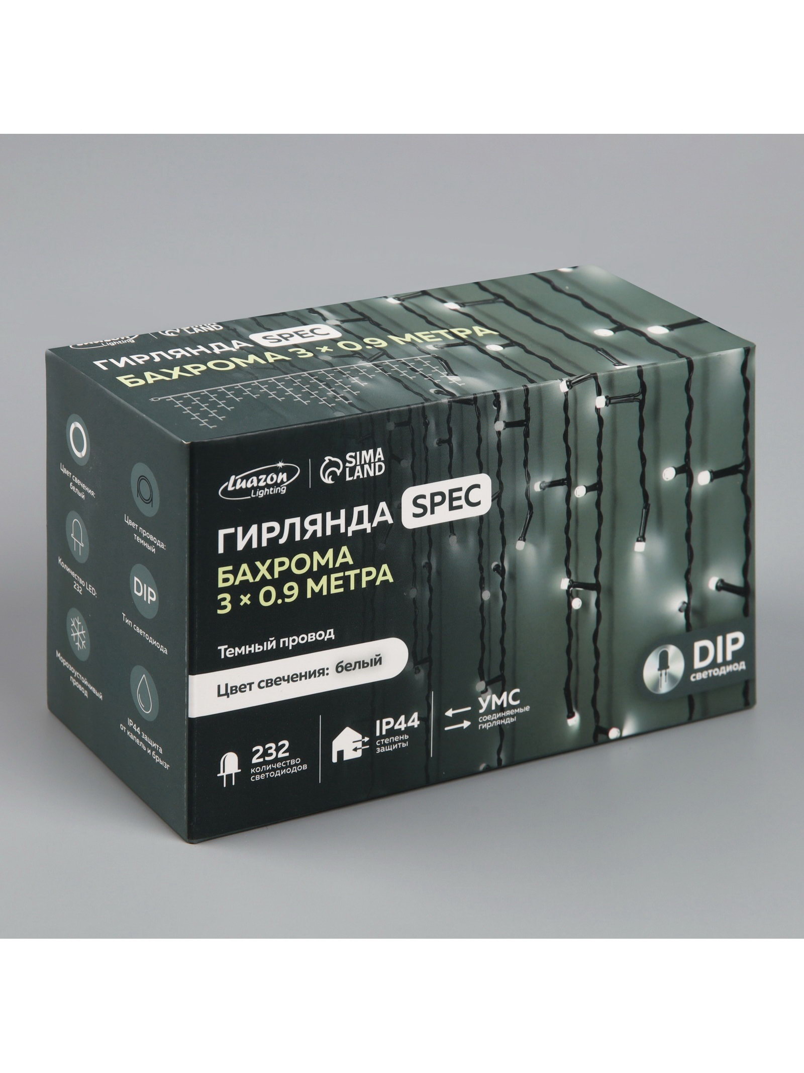 Гирлянда "Бахрома" 3 x 0.9 м, IP44, УМС, тёмная нить, 232 LED, свечение белое, 220 В, 8x10x20 см., Luazon Lighting, Китай
