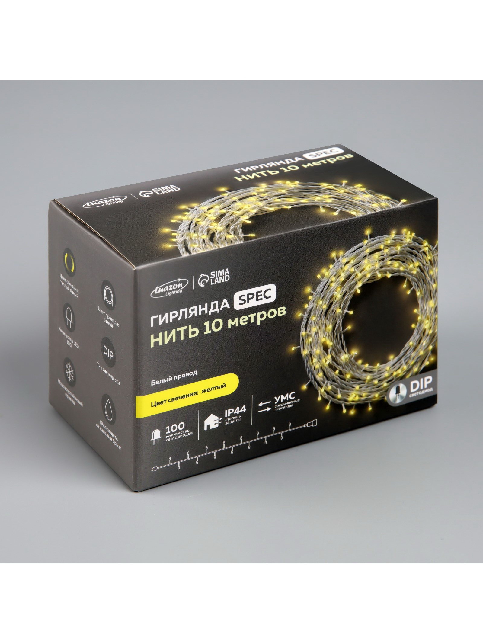 Гирлянда "Нить" 10 м, IP44, УМС, белая нить, 100 LED, свечение жёлтое, 220 В, 9x15x8.5 см., Luazon Lighting, Китай
