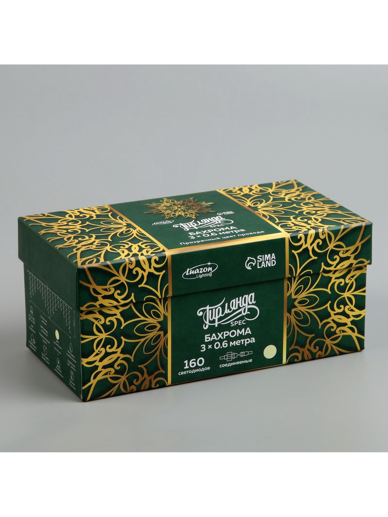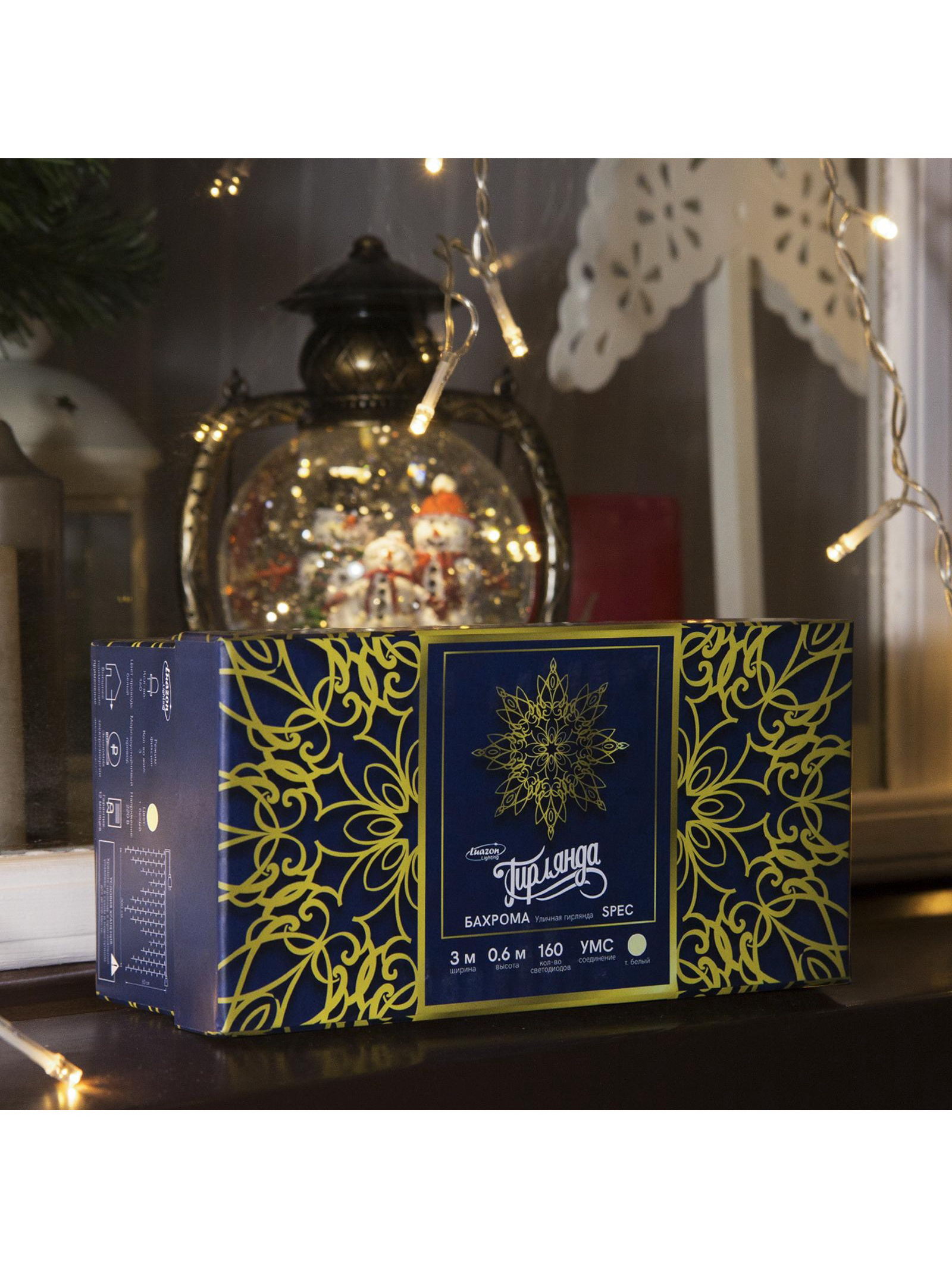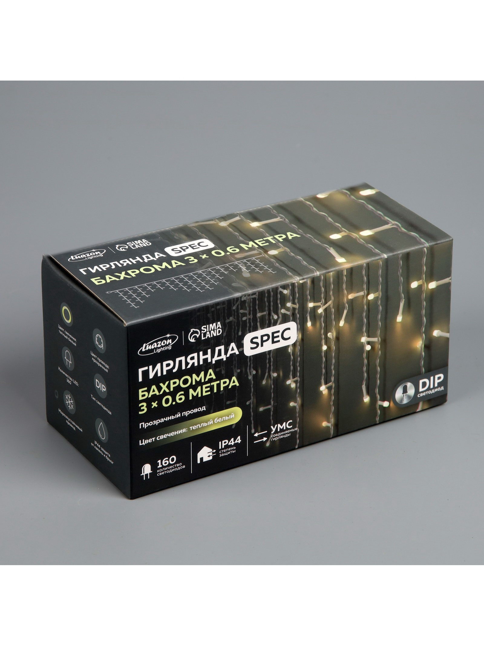 Гирлянда "Бахрома" 3 x 0.6 м, IP44, УМС, прозрачная нить, 160 LED, свечение тёплое белое, 220 В, 8x9x18 см., Luazon Lighting, Китай