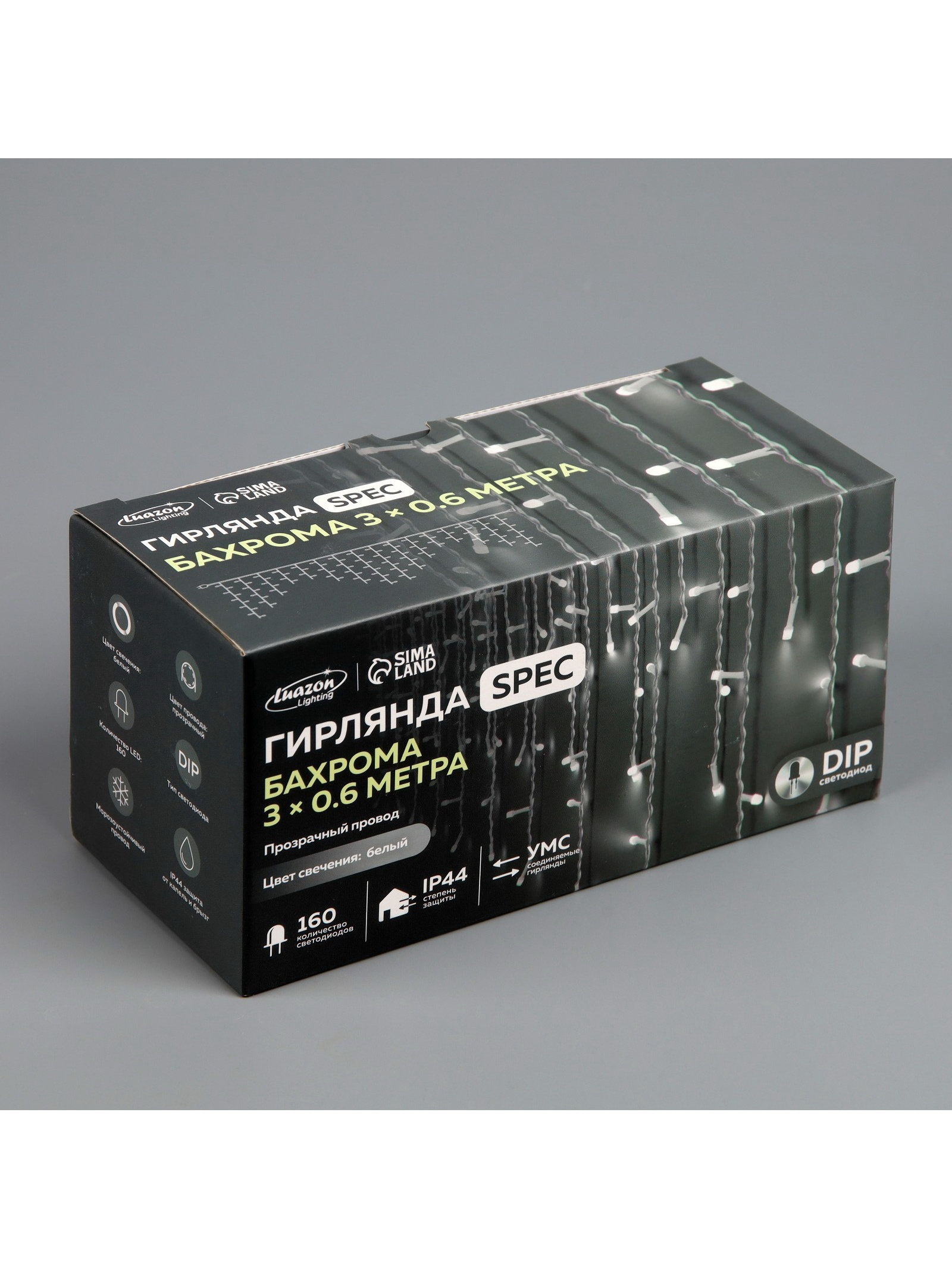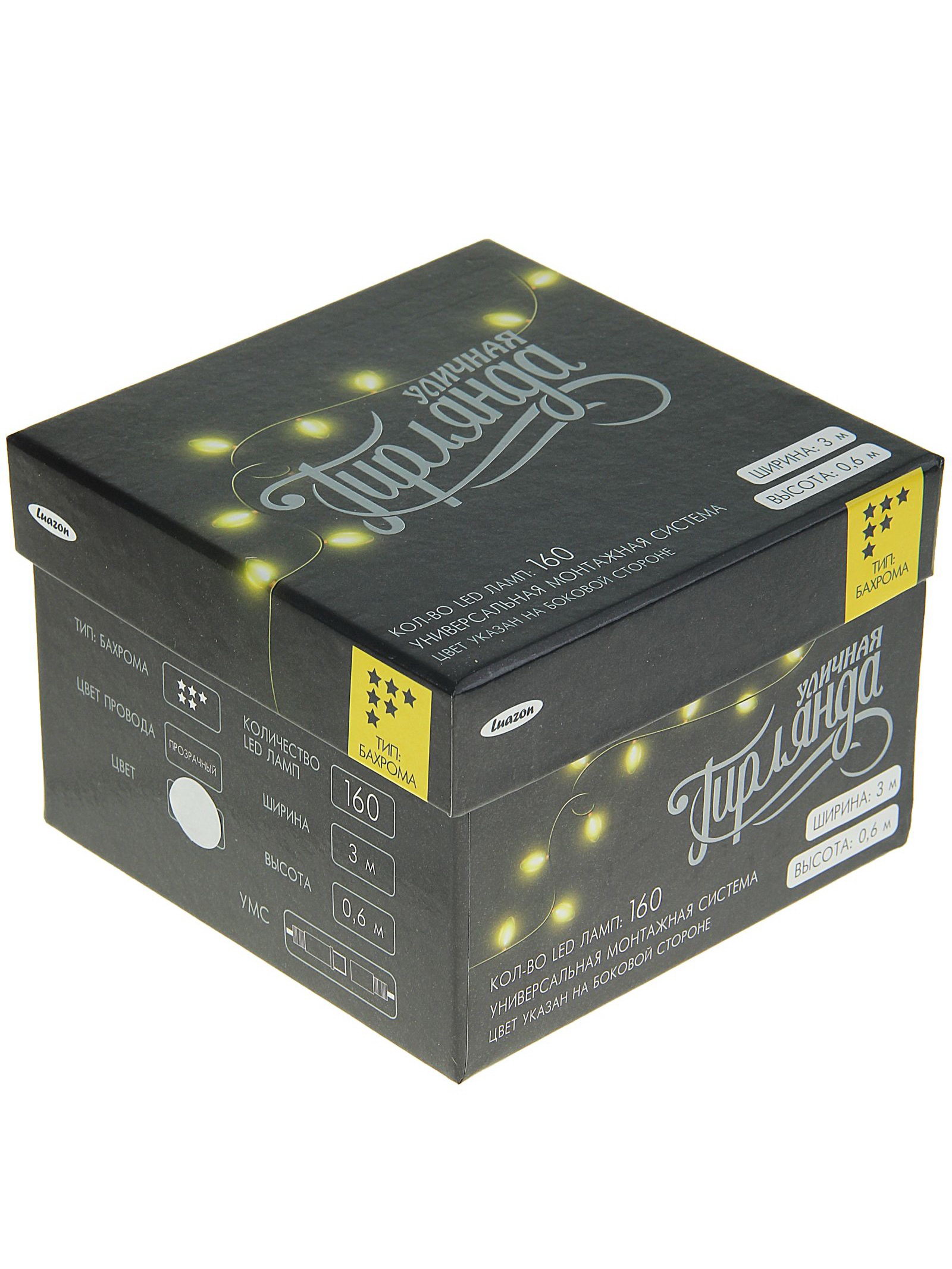 Гирлянда "Бахрома" 3 x 0.6 м, IP44, УМС, прозрачная нить, 160 LED, свечение белое, 220 В, 8x9x18 см., Luazon Lighting, Китай