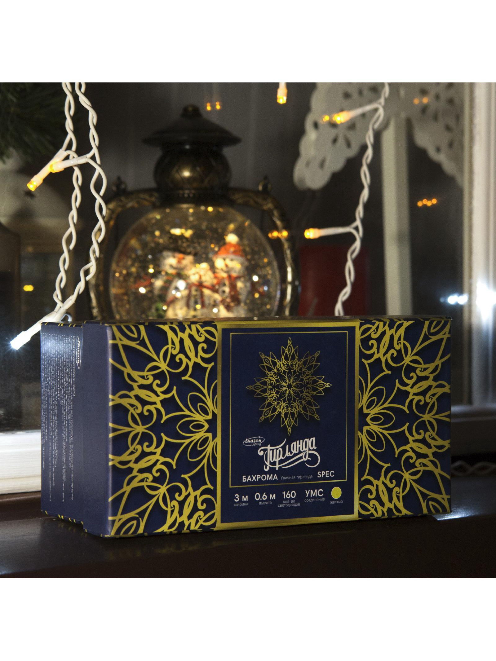 Гирлянда "Бахрома" 3 x 0.6 м, IP44, УМС, белая нить, 160 LED, свечение жёлтое, мерцание белым, 220 В, 8x9x18 см., Luazon Lighting, Китай