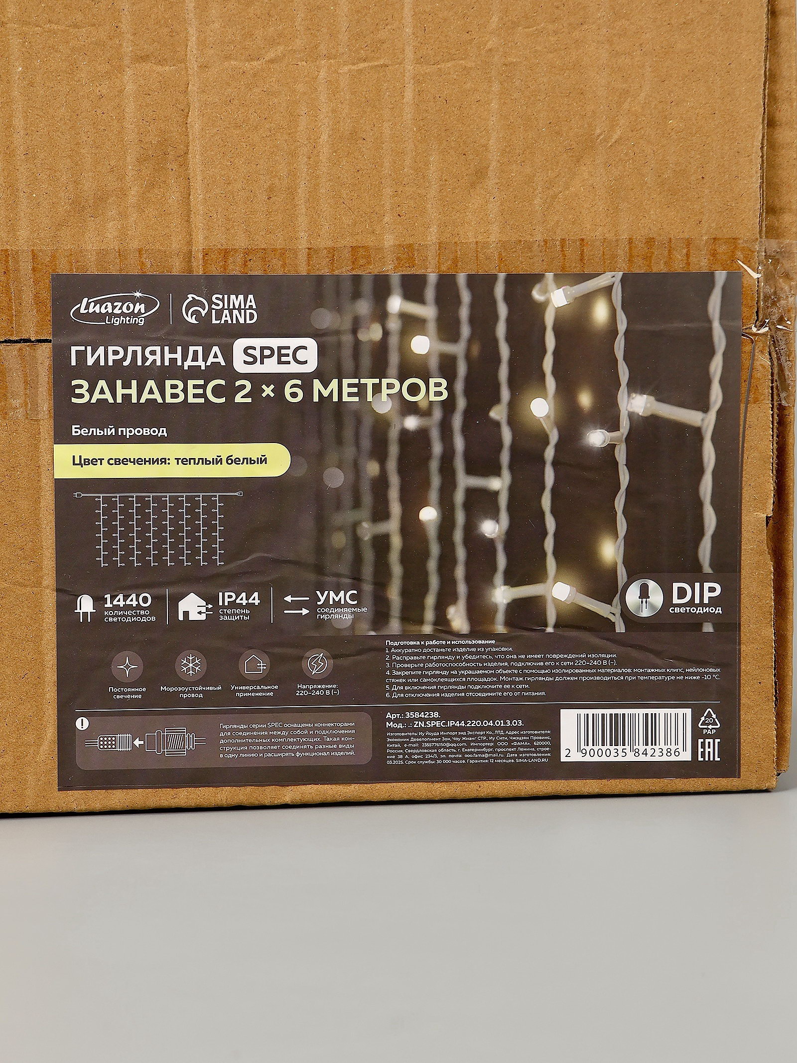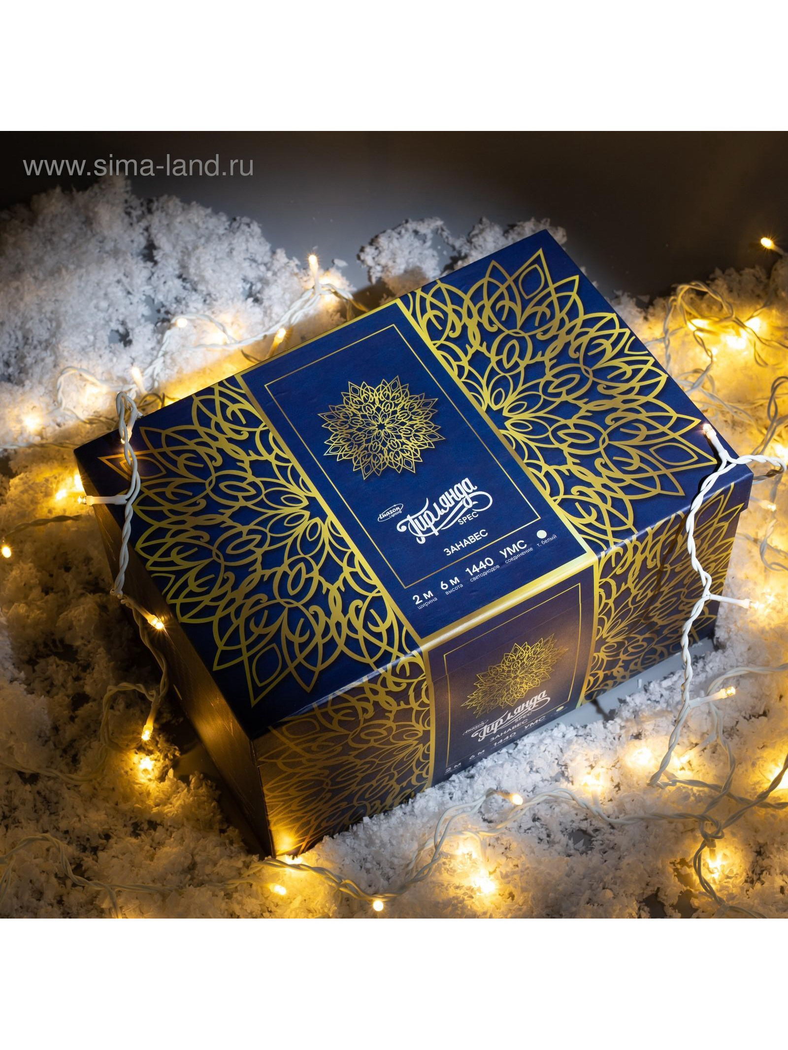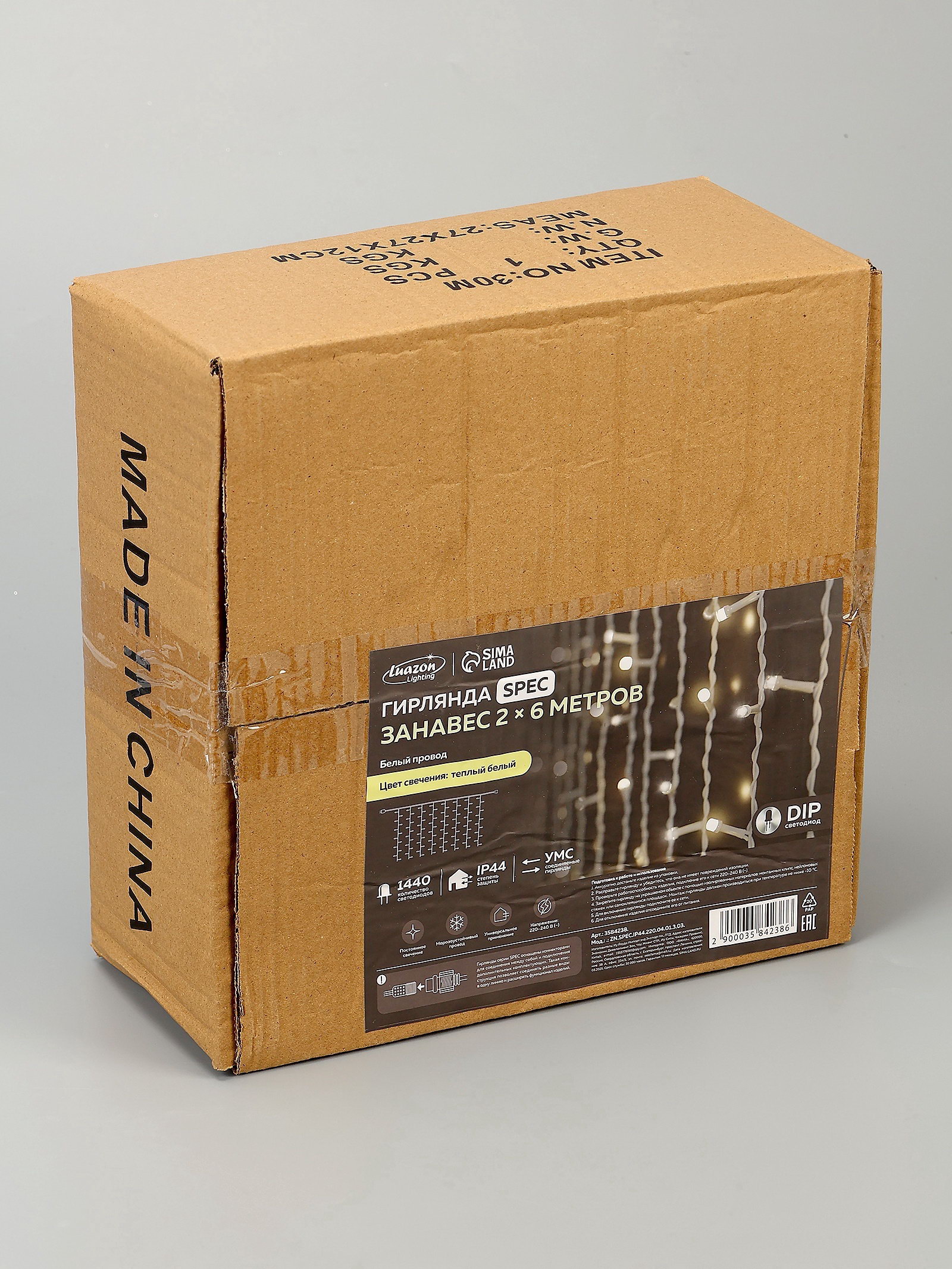 Гирлянда "Занавес" 2 x 6 м, IP44, УМС, белая нить, 1440 LED, свечение тёплое белое, 220 В, 30x30x14 см., Luazon Lighting, Китай