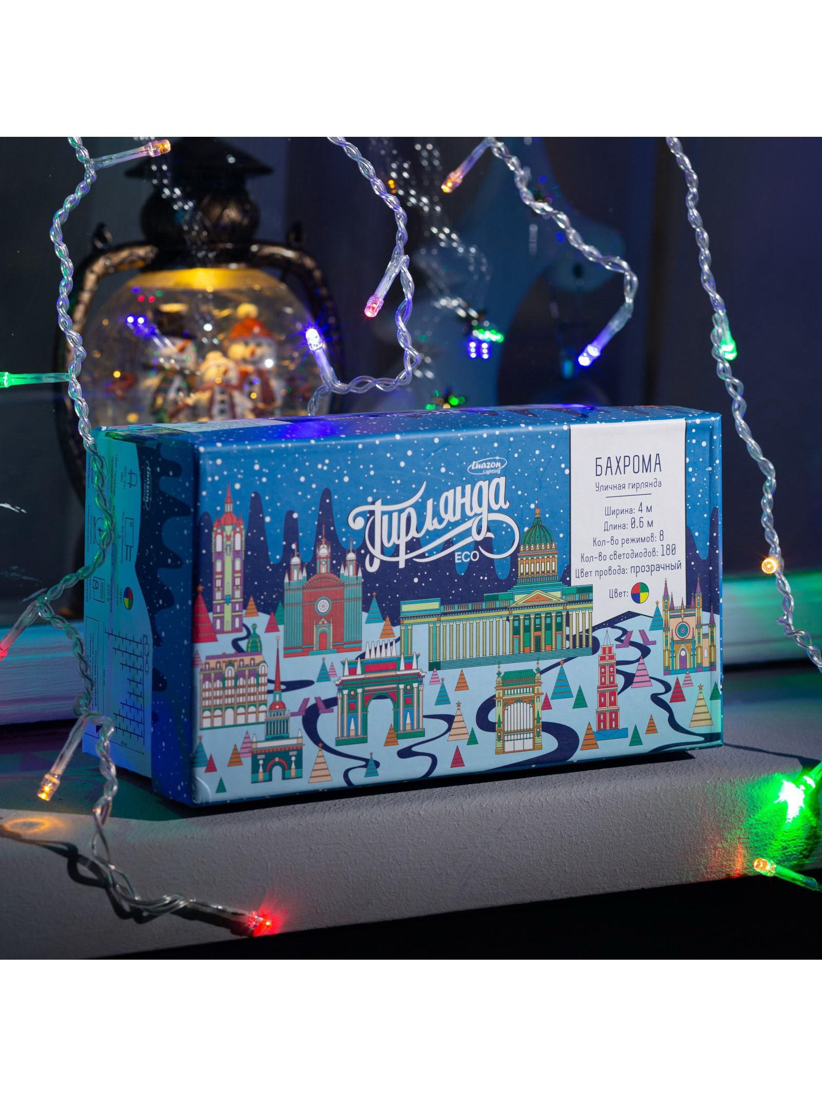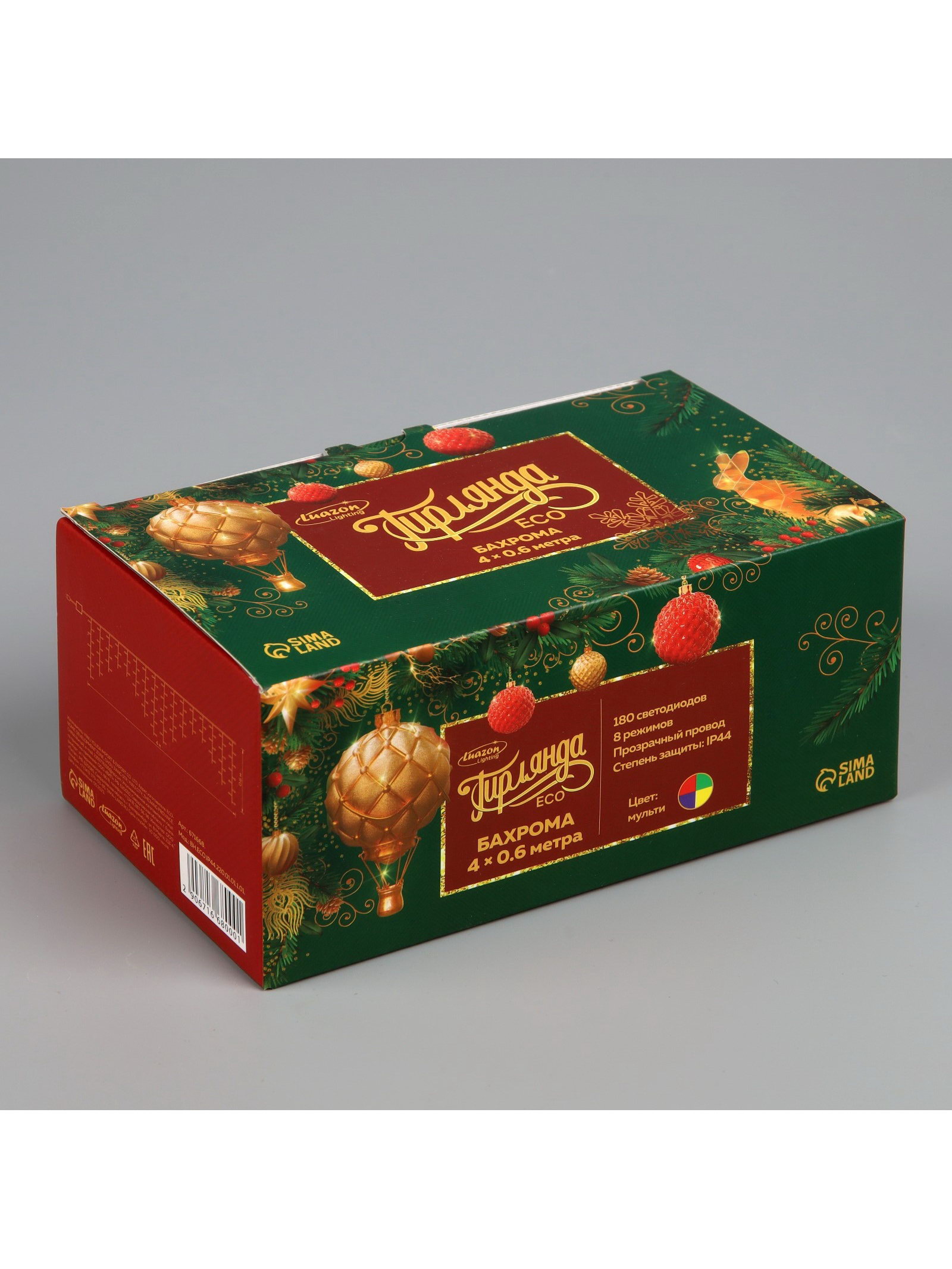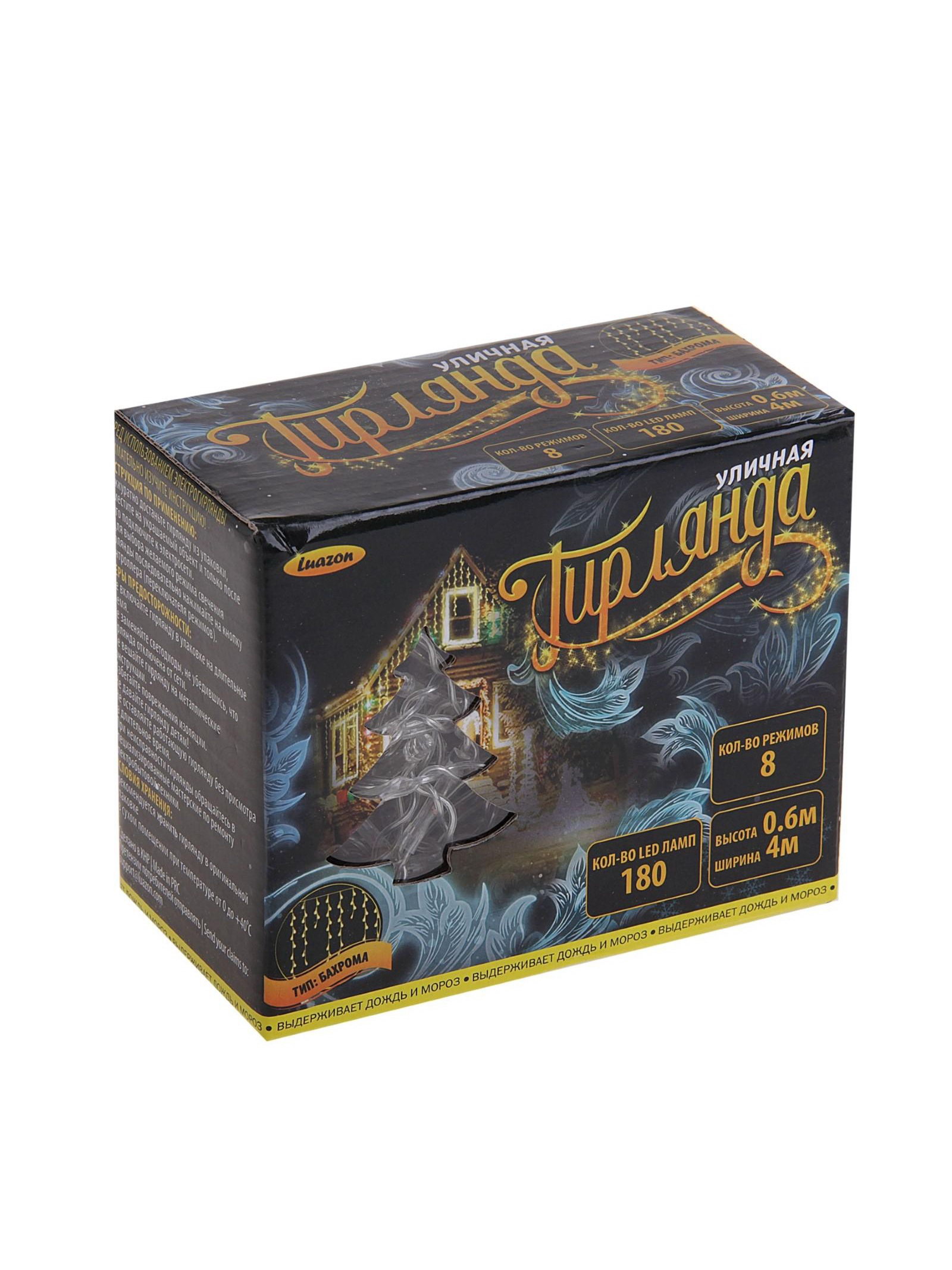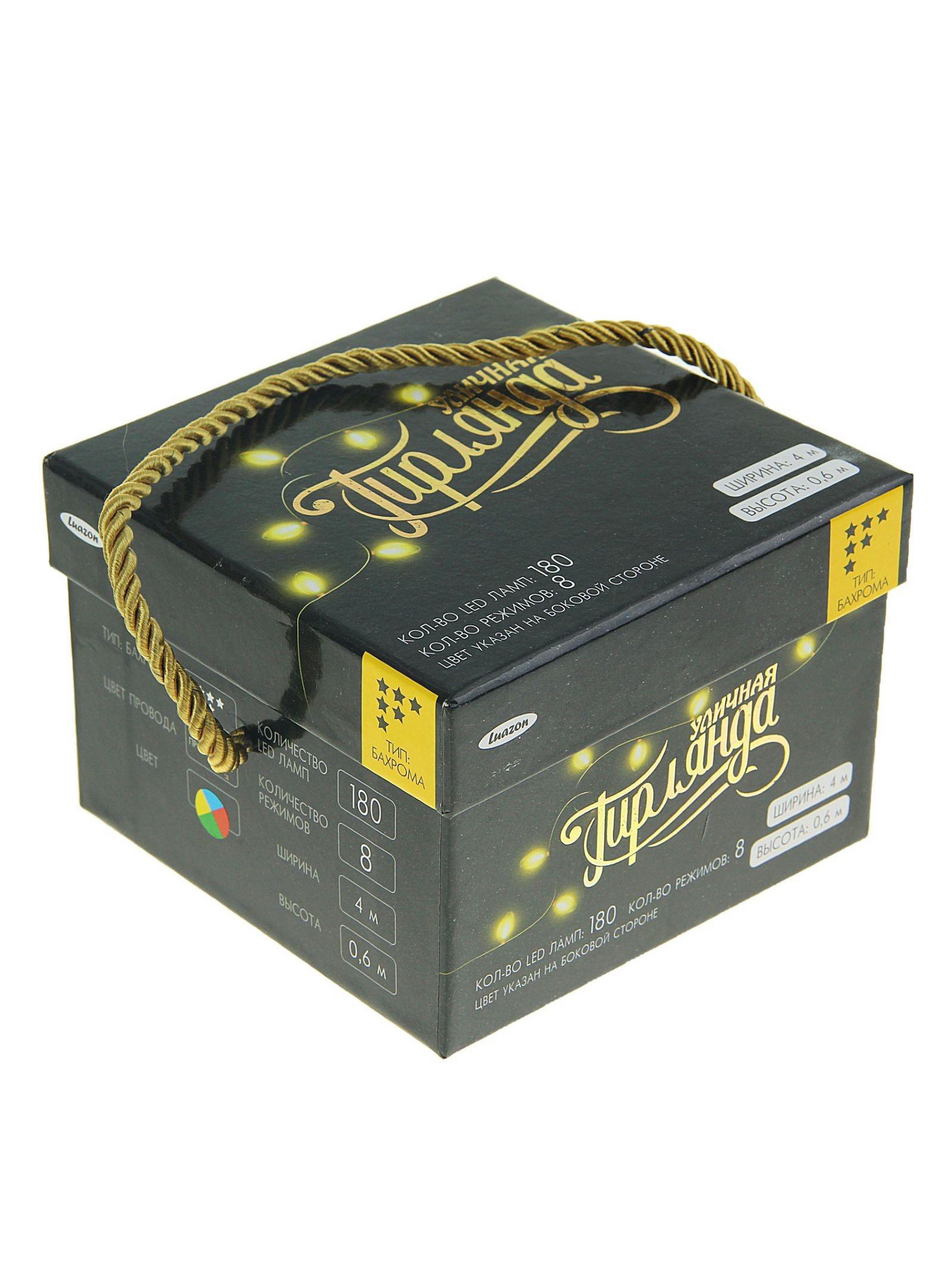 Размер упаковки: 10 x 9 x 18 см. Насадки: Нет Цвет нити гирлянды: Прозрачный Применение: Уличное Вид лампы: Светодиодная Размер, м: 4 x 0.6 Вид гирлянды: Бахрома Тип подключения: С контроллером Количество режимов: 8 Наличие блока питания: Нет Режим работы: Задаётся контроллером Цвет свечения: Мульти Цвет свечения: Мульти tnved: 9405310000 Гарантийный срок, мес.: 12 Количество ламп: 180 Вид насадки: Без насадок Вид светодиода: DIP Высота, м: 0.6 Ширина, м: 4 Степень защиты: IP44 Тематика праздника: Новый год Материал нити: ПВХ Необходимая комплектация: Не нужна Температурный режим: От -30 до +35 ℃ Тип питания: От сети 220 В