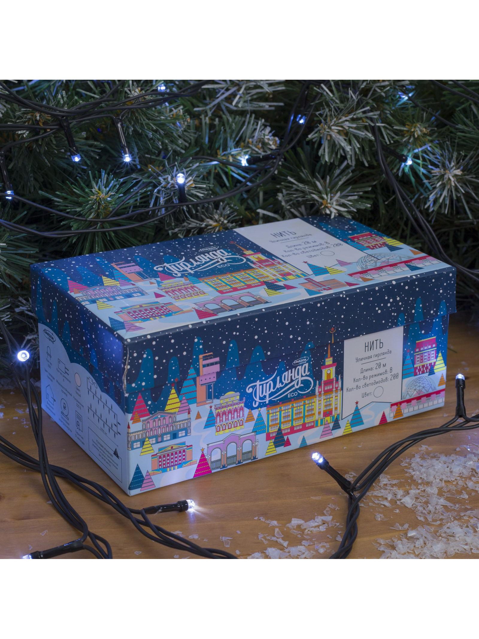 Размер упаковки: 10 x 8.5 x 17 см. Насадки: Нет Длина, м: 20 Цвет нити гирлянды: Тёмный Применение: Уличное Вид лампы: Светодиодная Вид гирлянды: Гирлянда-нить Цвет свечения: Белый Количество режимов: 8 Тип подключения: С контроллером Режим работы: Задаётся контроллером tnved: 9405310000 Гарантийный срок, мес.: 12 Количество ламп: 200 Вид насадки: Без насадок Вид светодиода: DIP Степень защиты: IP44 Тематика праздника: Новый год Материал нити: ПВХ Необходимая комплектация: Не нужна Температурный режим: От -30 до +35 ℃ Тип питания: От сети 220 В