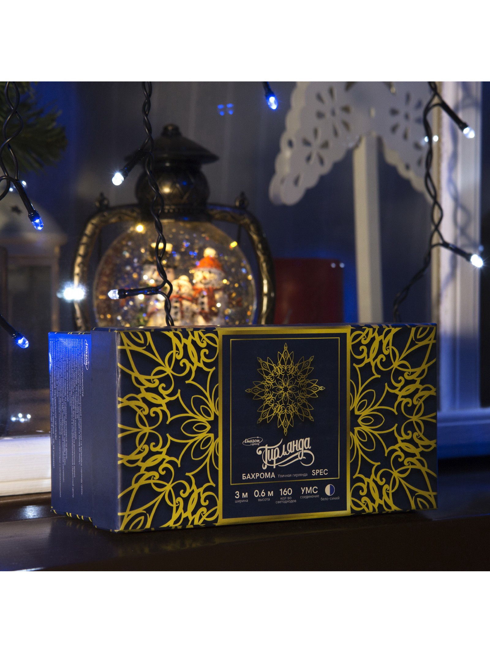 Гирлянда "Бахрома" 3 x 0.6 м, IP44, УМС, тёмная нить, 160 LED, свечение бело-синее, мигание, 220 В, 8x9x18 см., Luazon Lighting, Китай