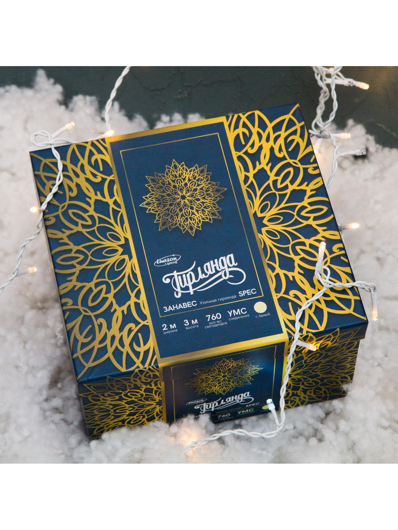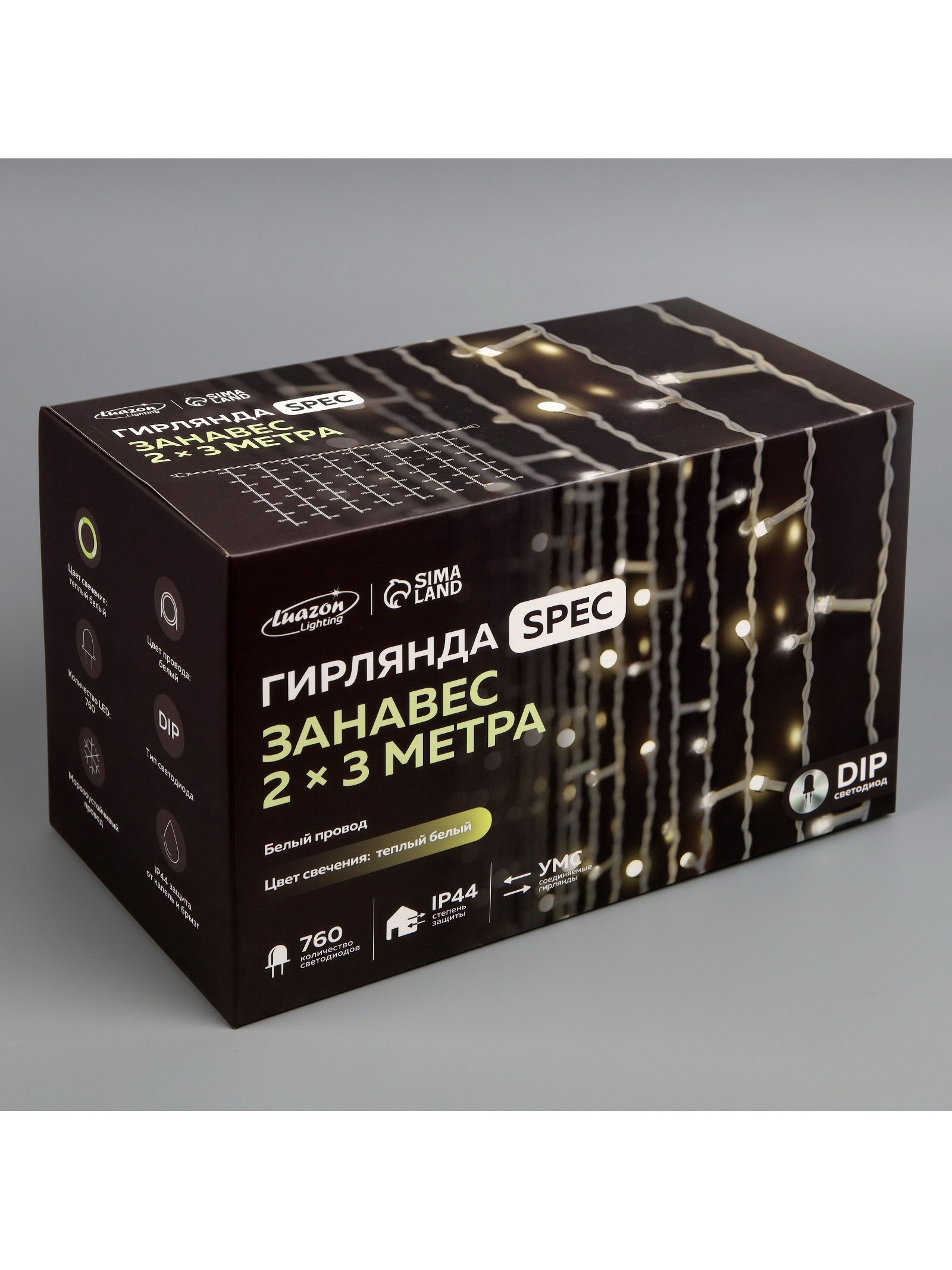 Гирлянда "Занавес" 2 x 3 м, IP44, УМС, белая нить, 760 LED, свечение тёплое белое, мерцание белым, 220 В, 15x28x18 см., Luazon Lighting, Китай