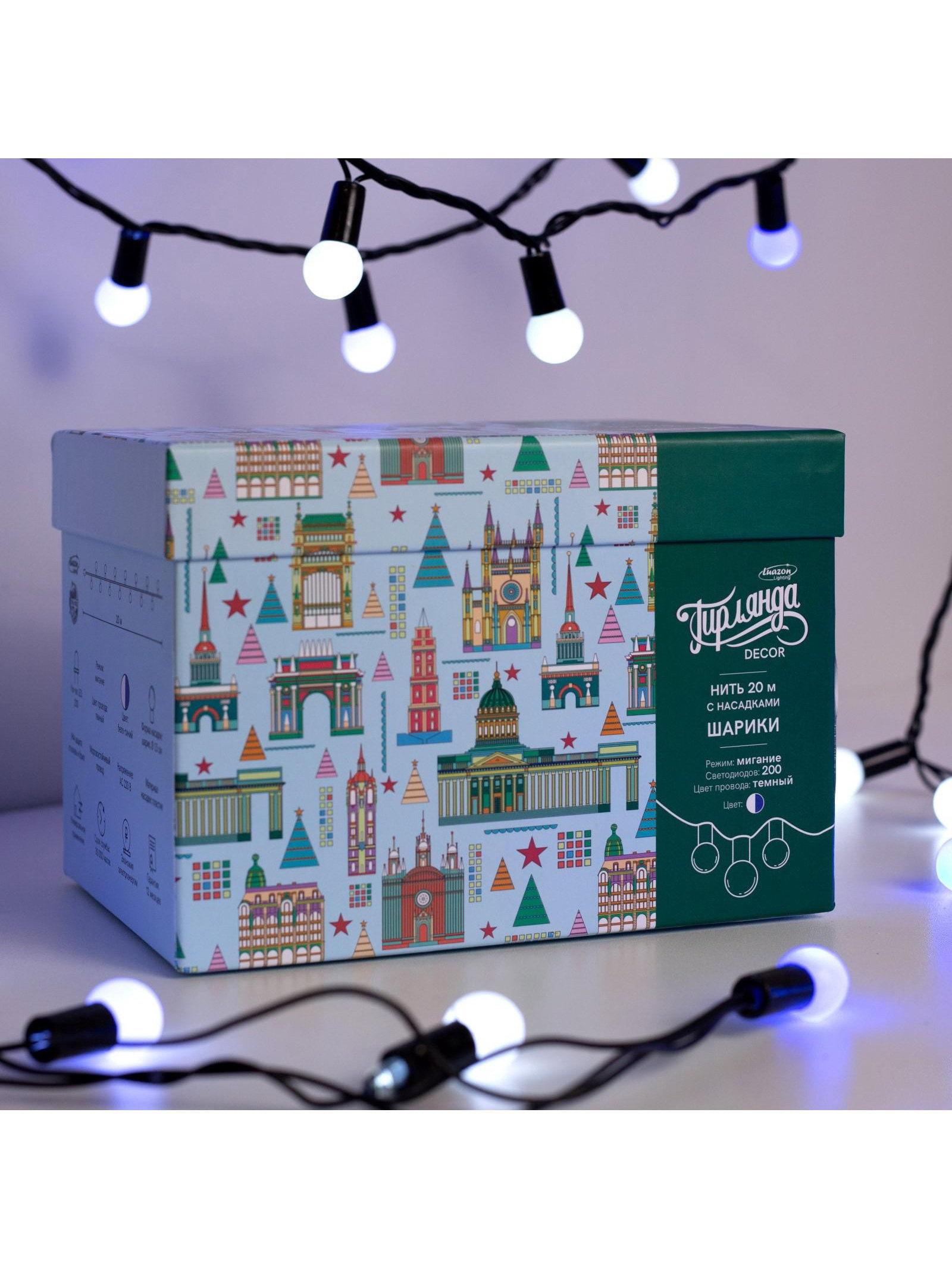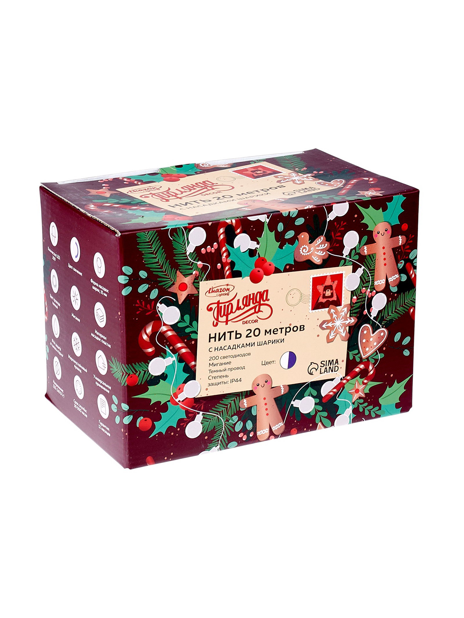 Гирлянда "Нить" 20 м с насадками "Шарики 1.5 см", IP44, тёмная нить, 200 LED, свечение бело-синее, мигание, 220 В, 8x8x20 см., Luazon Lighting, Китай