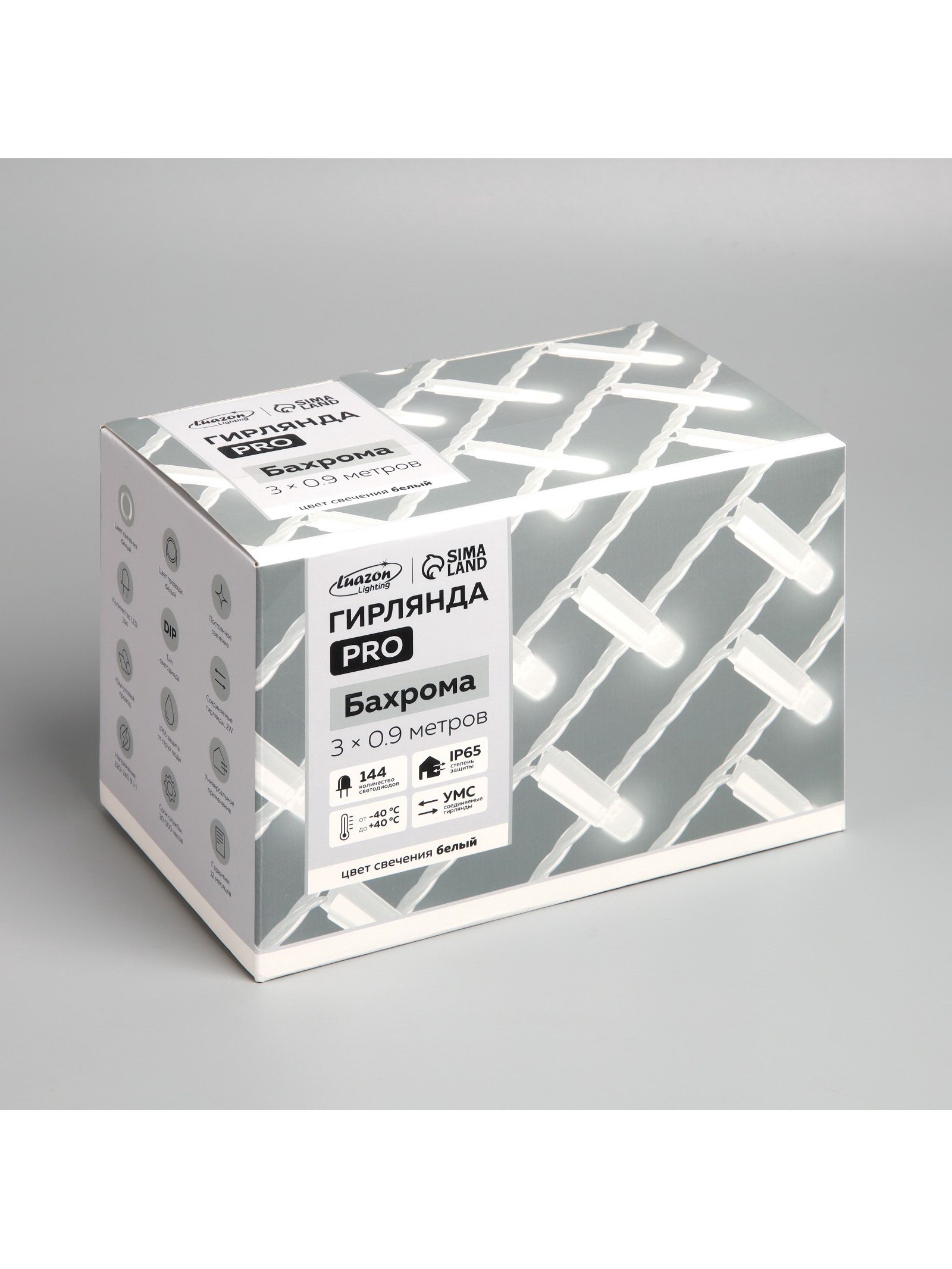 Гирлянда "Бахрома" 3 x 0.9 м, IP65, УМС, белая нить каучук, 144 LED, свечение белое, 220 В, 13x23x16 см., Luazon Lighting, Китай