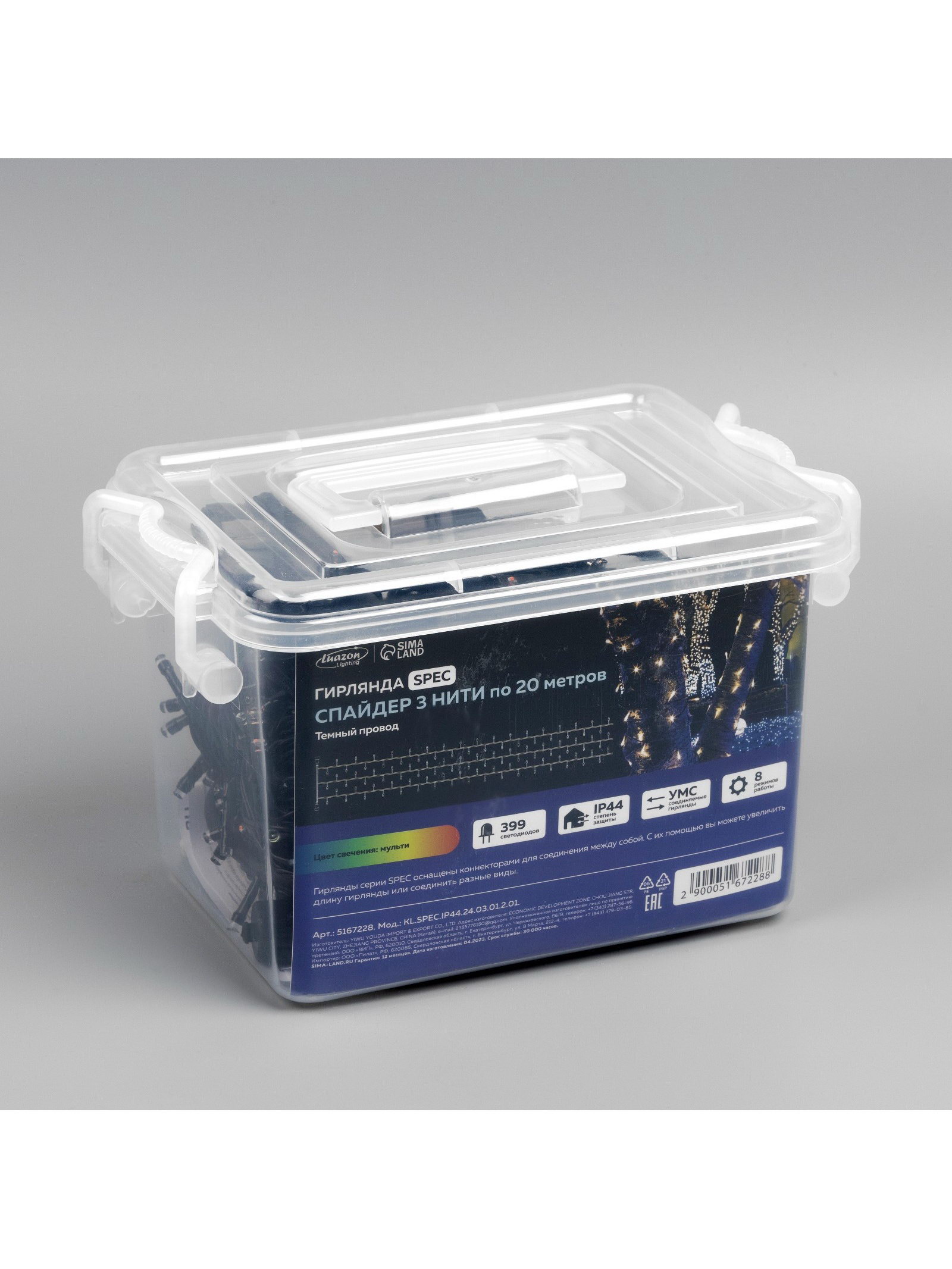 Гирлянда "Клип-лайт" 3 нити по 20 м, IP44, УМС, тёмная нить, 399 LED, свечение мульти, 8 режимов, 24 В, 20x30x15 см., Luazon Lighting, Китай