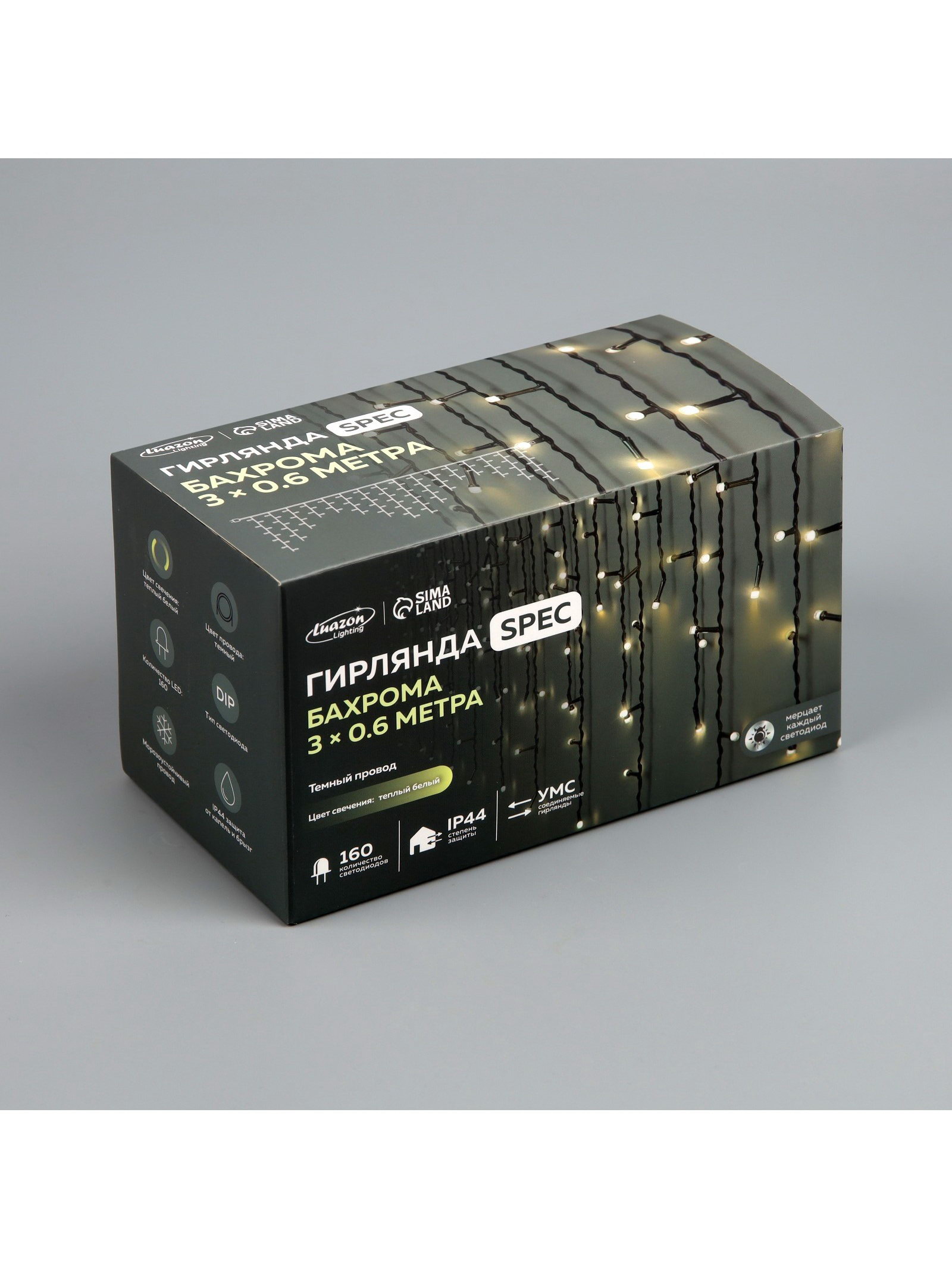 Гирлянда "Бахрома" 3x0.6 м, IP44, УМС, тёмная нить, 100 LED, свечение тёплое белое, мерцание, 24 В, Luazon Lighting, Китай