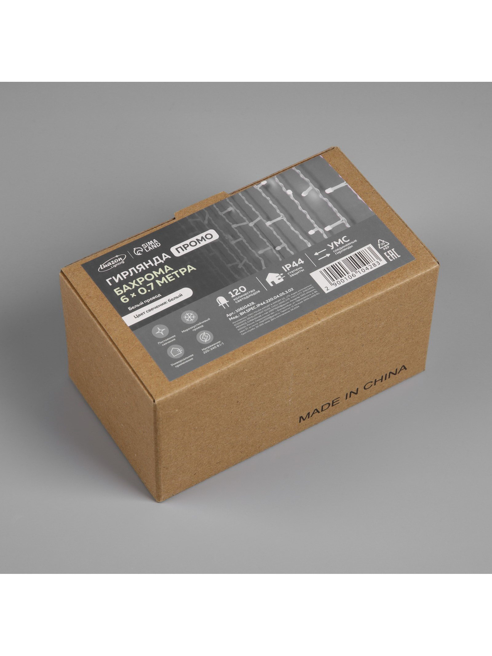 Гирлянда "Бахрома" 6x0.7 м, IP44, УМС, белая нить, 120 LED, свечение белое, 220 В, 13x13x8 см., Luazon Lighting, Китай