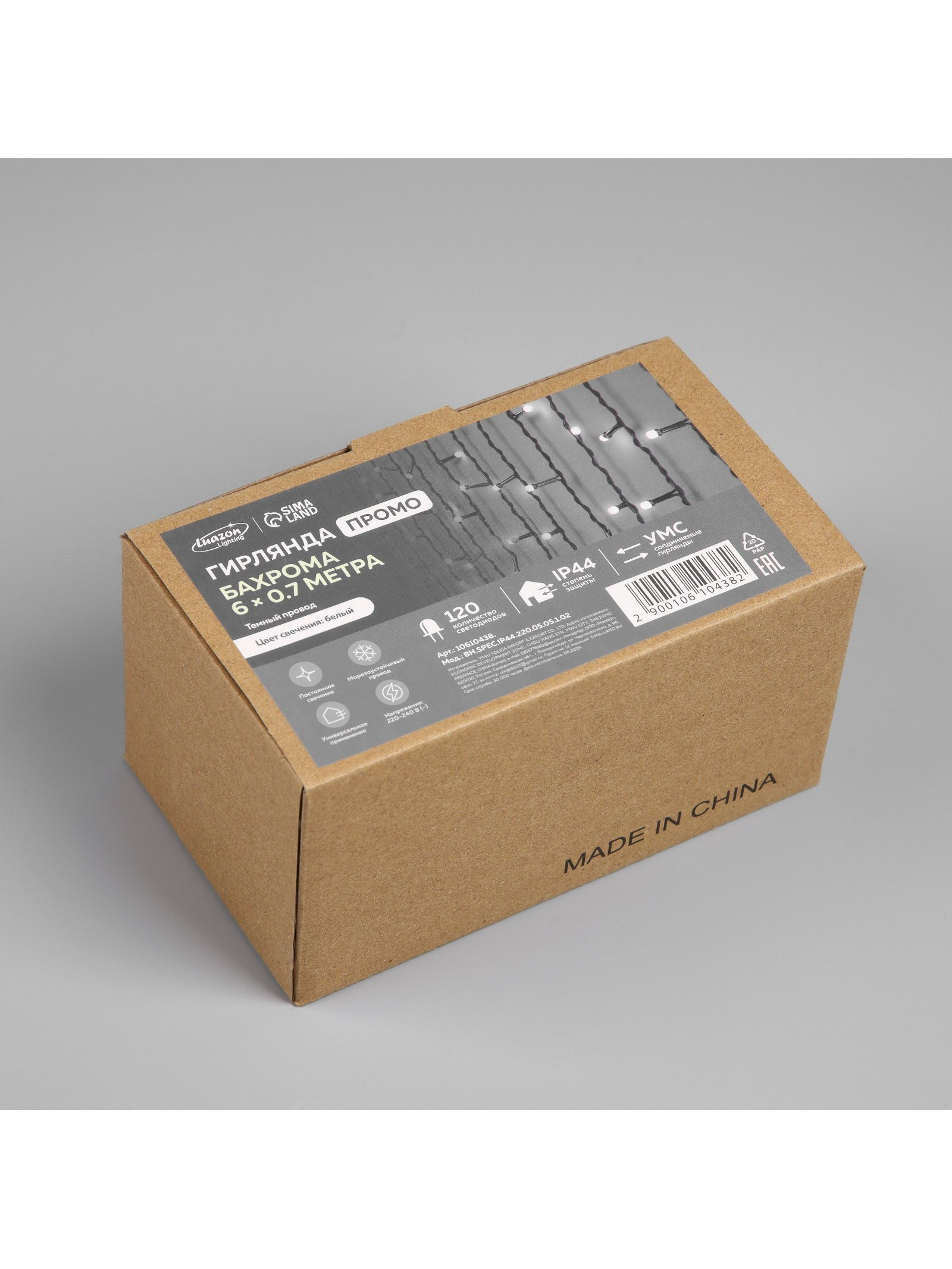 Гирлянда "Бахрома" 6x0.7 м, IP44, УМС, тёмная нить, 120 LED, свечение белое, 220 В, 13x13x8 см., Luazon Lighting, Китай