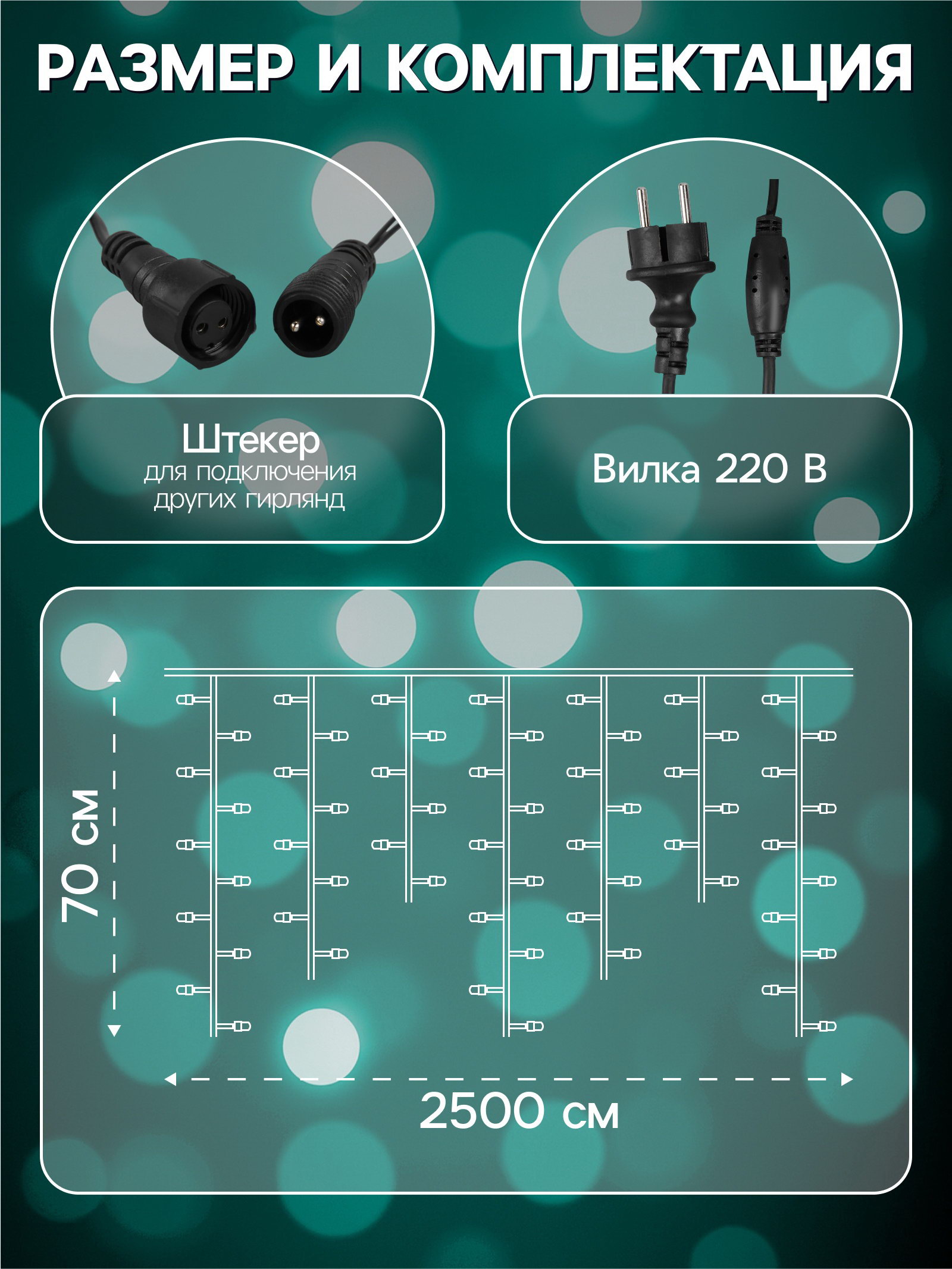 Количество жил: 2, 2 Размер упаковки: 15 x 10 x 21 см. Количество режимов: 1 Тип подключения: Шнур питания Количество ламп: 450 Размер, м: 25 x 0.7 Наличие блока питания: Нет Цвет нити гирлянды: Тёмный Вид лампы: Светодиодная Материал нити: ПВХ Насадки: Нет Вид гирлянды: Бахрома Тип питания: От сети 220 В Режим работы: Постоянное свечение Необходимая комплектация: Не нужна Степень защиты: IP44 Цвет свечения: Мульти Применение: Уличное Температурный режим: От -15 до +40 ℃ Вид светодиода: DIP tnved: 9405310000 Гарантийный срок, мес.: 12 | ||