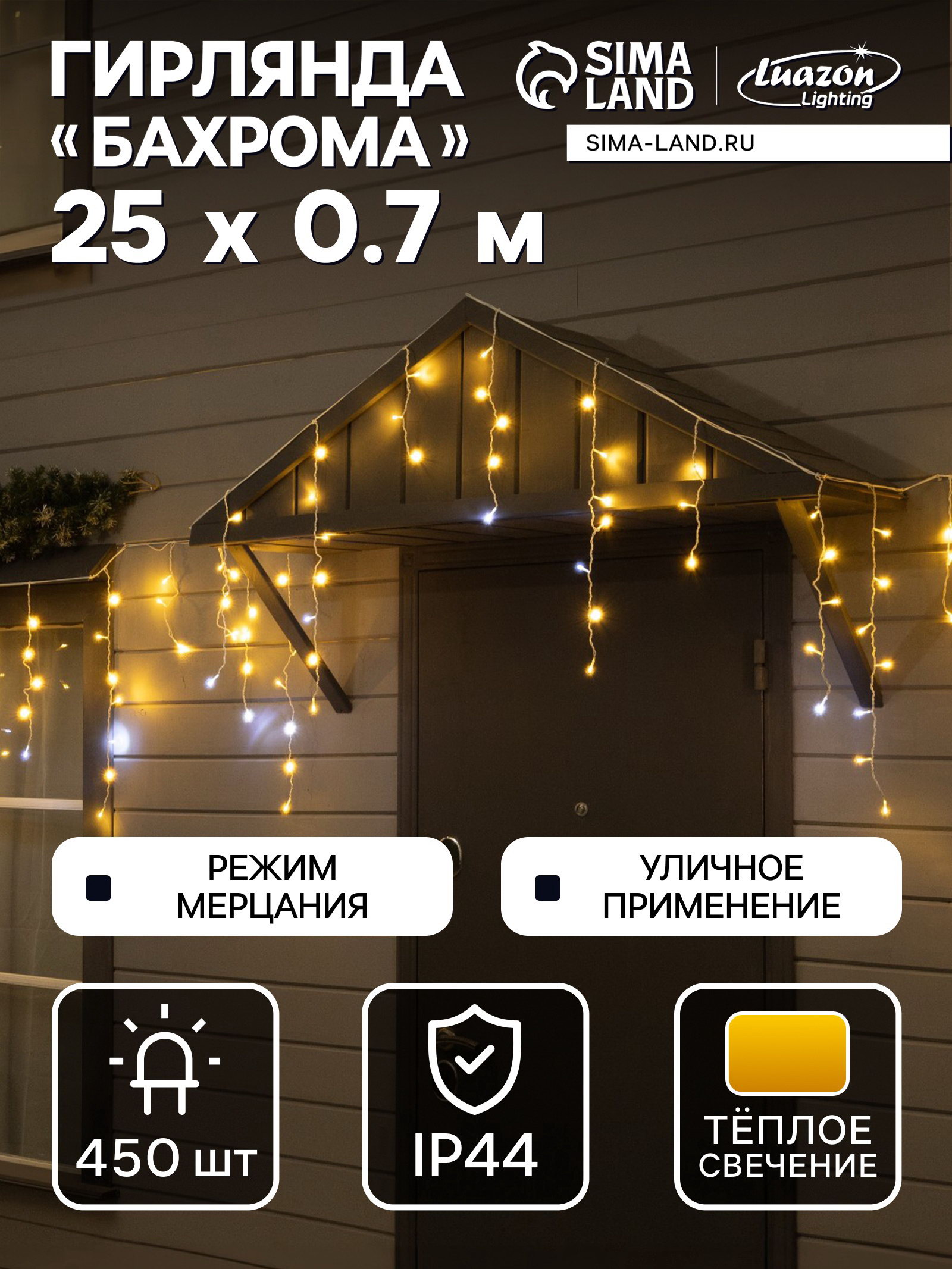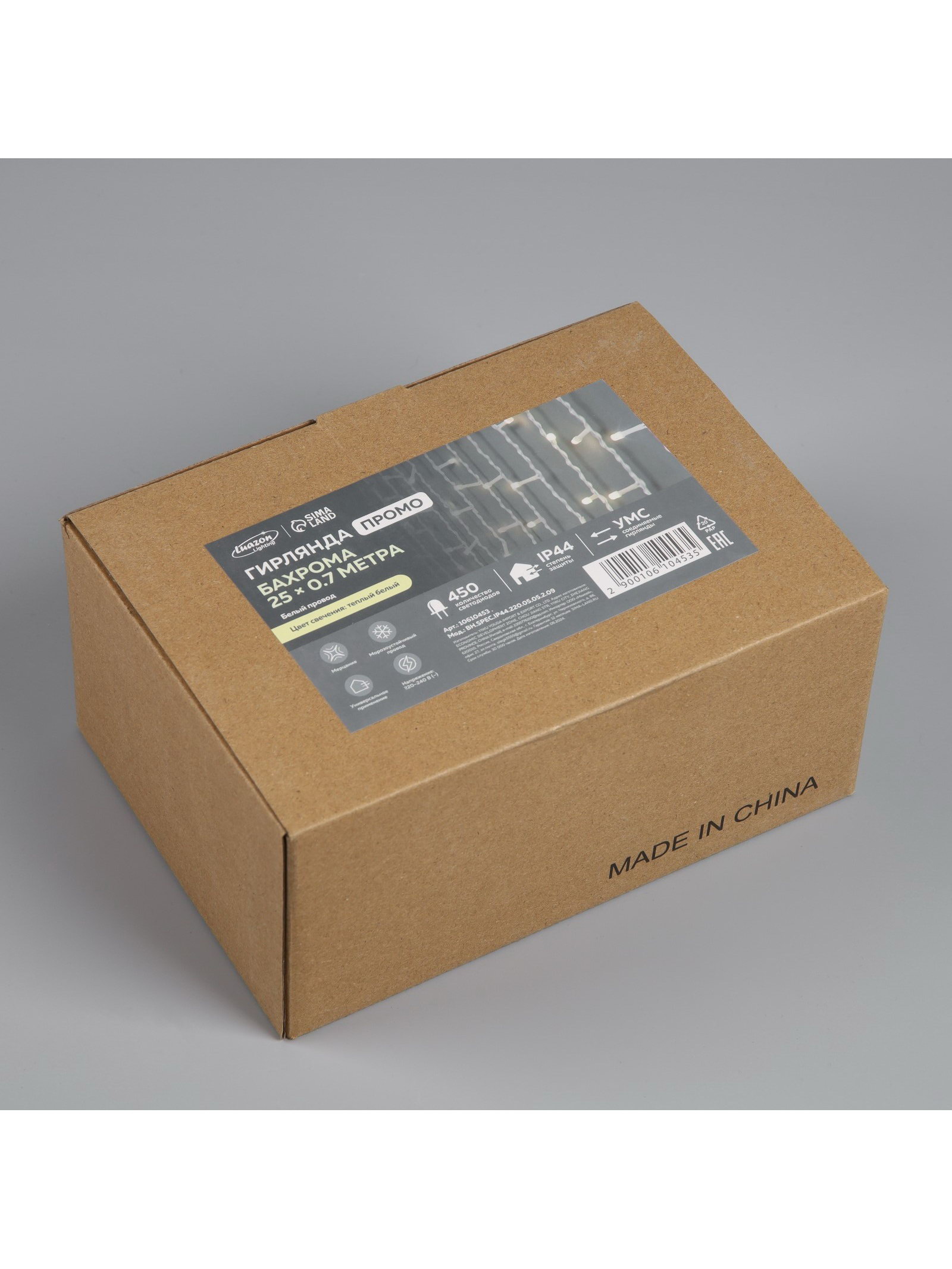 Гирлянда "Бахрома" 25x0.7 м, IP44, УМС, белая нить, 450 LED, свечение тёплое белое, мерцание, 220 В, 19x19x10 см., Luazon Lighting, Китай