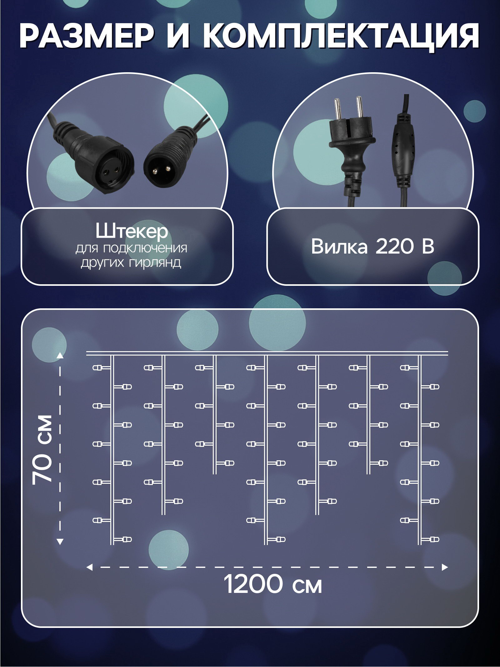 Гирлянда "Бахрома" 12 x 0.7 м, IP44, УМС, тёмная нить, 240 LED, свечение белое, мерцание 220 В, 16x16x9 см., Luazon Lighting, Китай