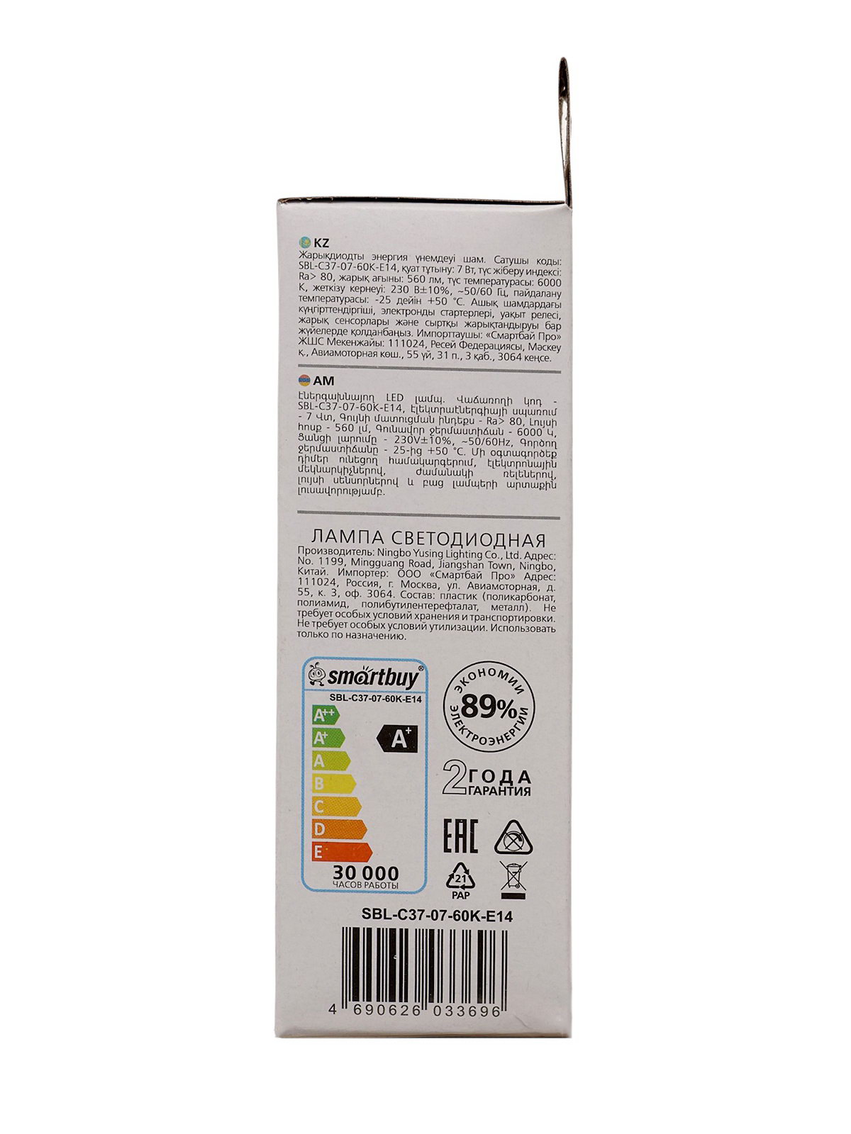 Лампа светодиодная E14, C37, 7 Вт, 6000 К, холодный белый свет, Smartbuy, Китай
