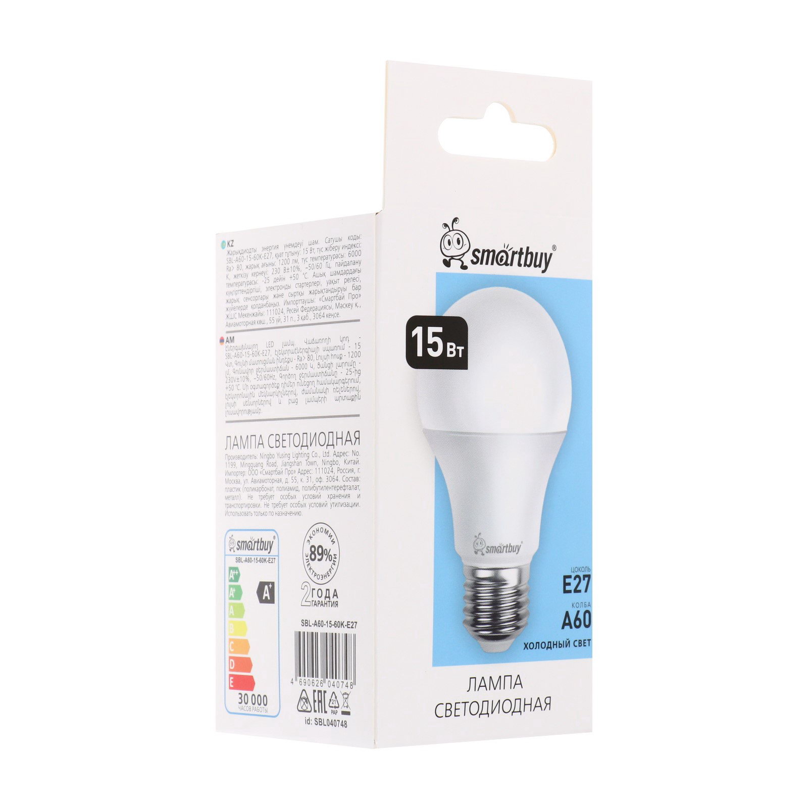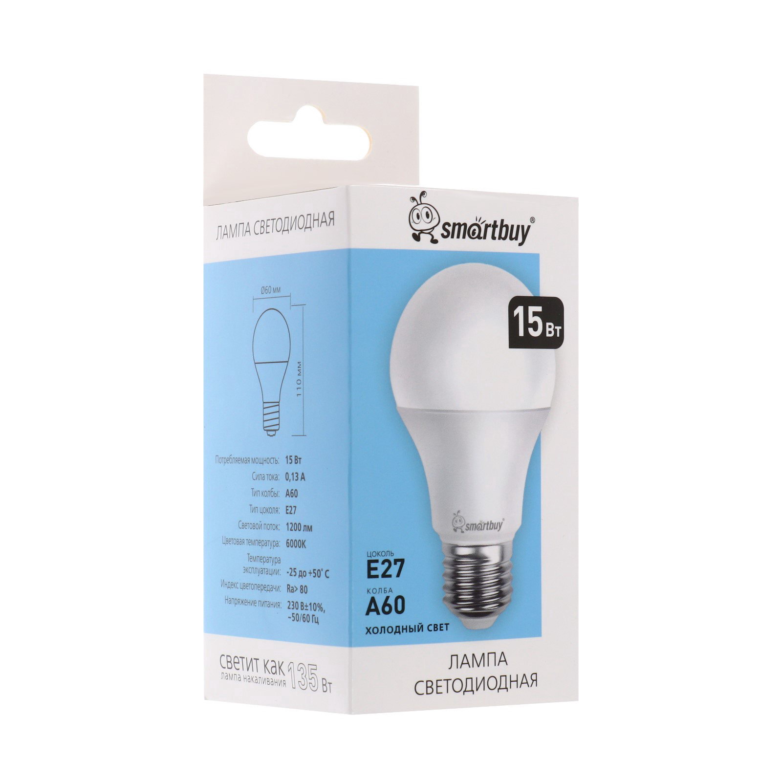Лампа светодиодная Е27, А60, 15 Вт, 6000 К, холодный белый свет, Smartbuy, Китай