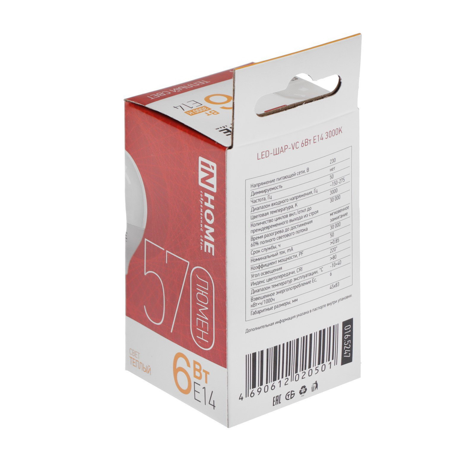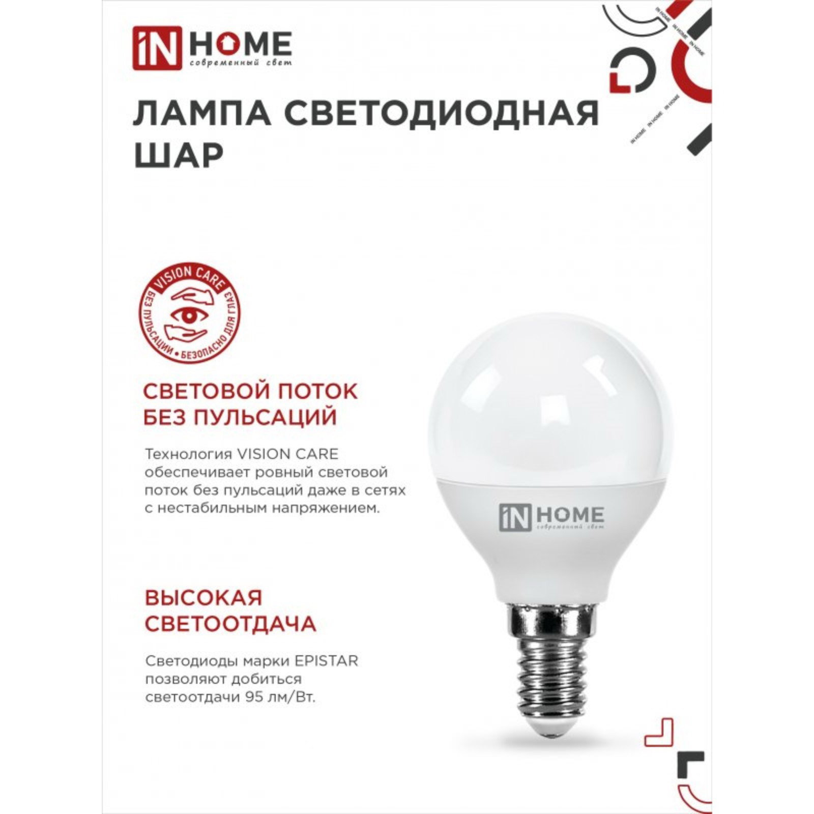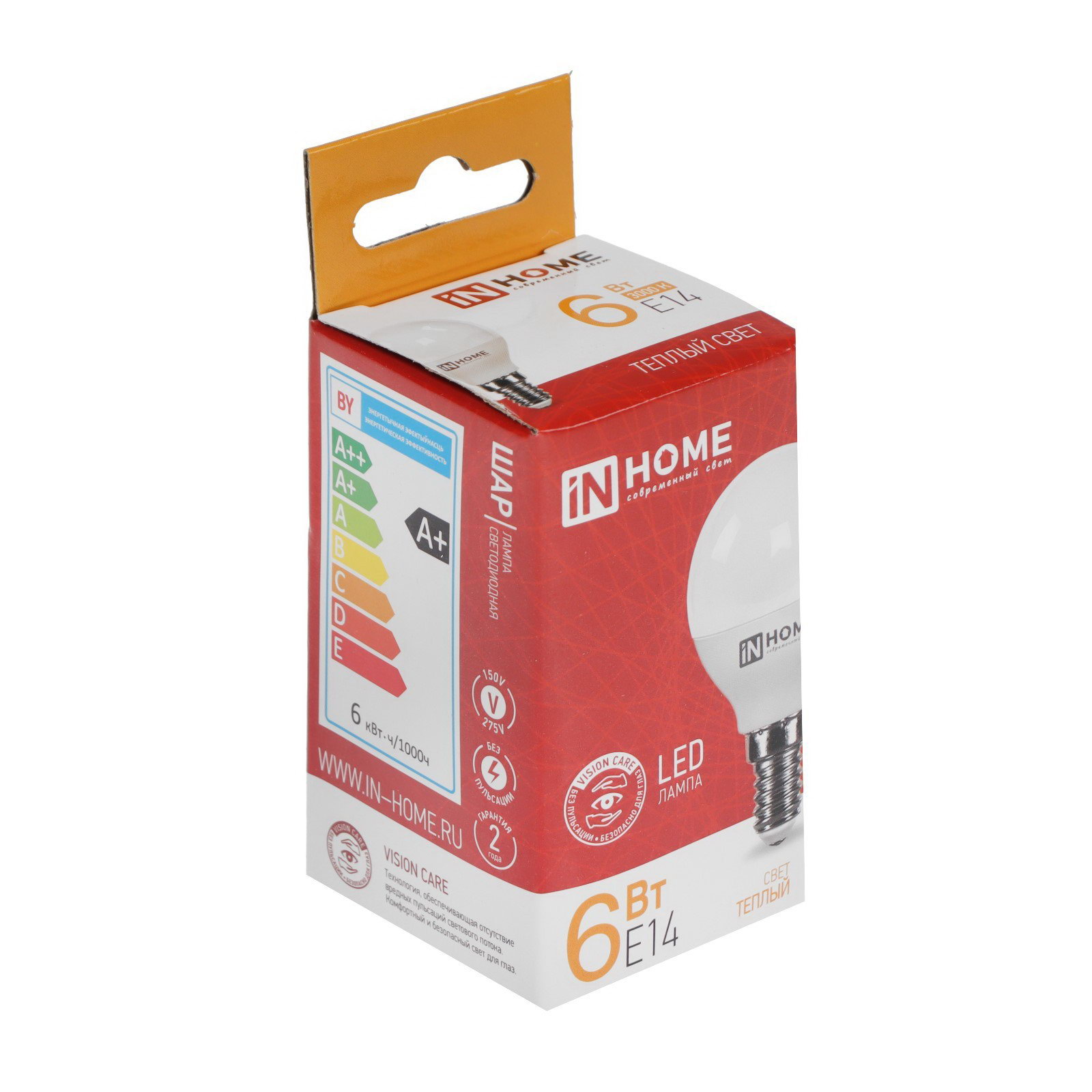 Лампа светодиодная IN HOME, Е14, G45, 6 Вт, 540 Лм, 3000 К, теплый белый, INhome, Китай