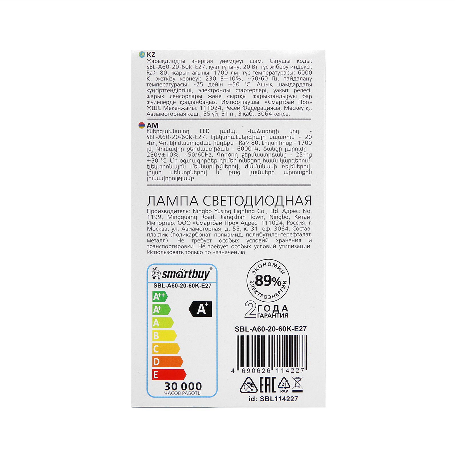 Лампа светодиодная E27, A60, 20 Вт, 6000 К, холодный белый свет, Smartbuy, Китай