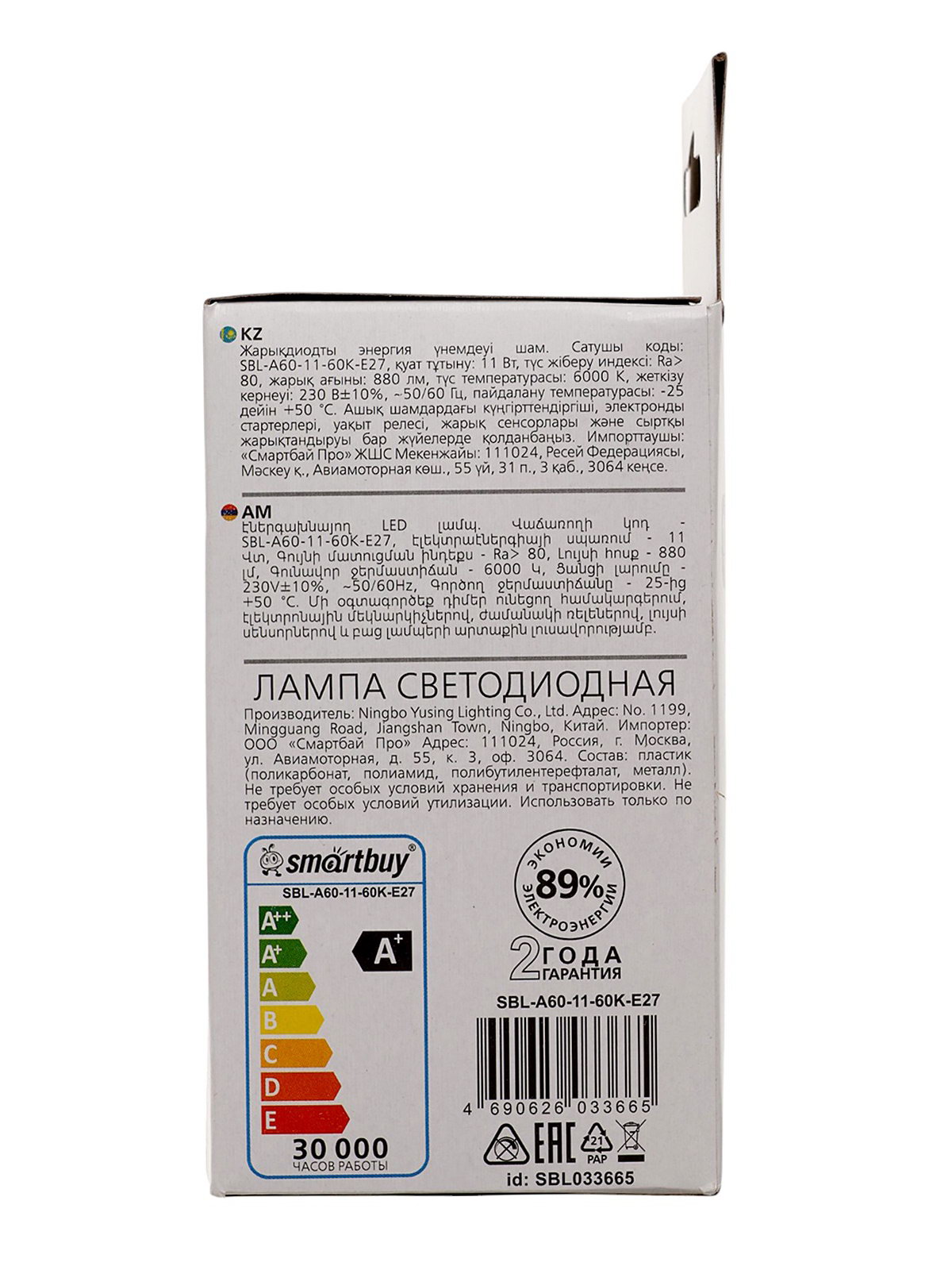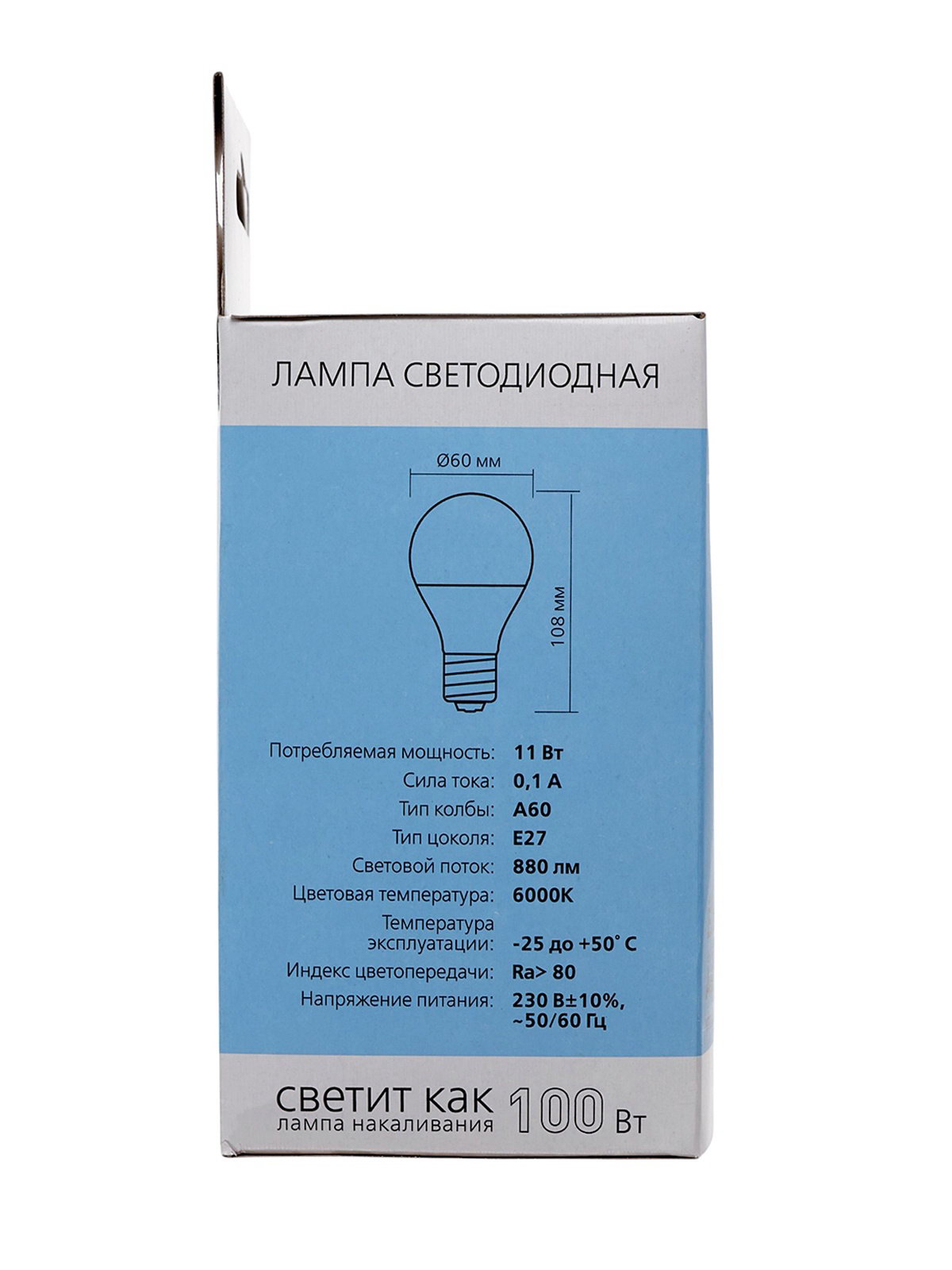 Лампа светодиодная E27, A60, 11 Вт, 6000 К, свечение холодное белое, Smartbuy, Китай