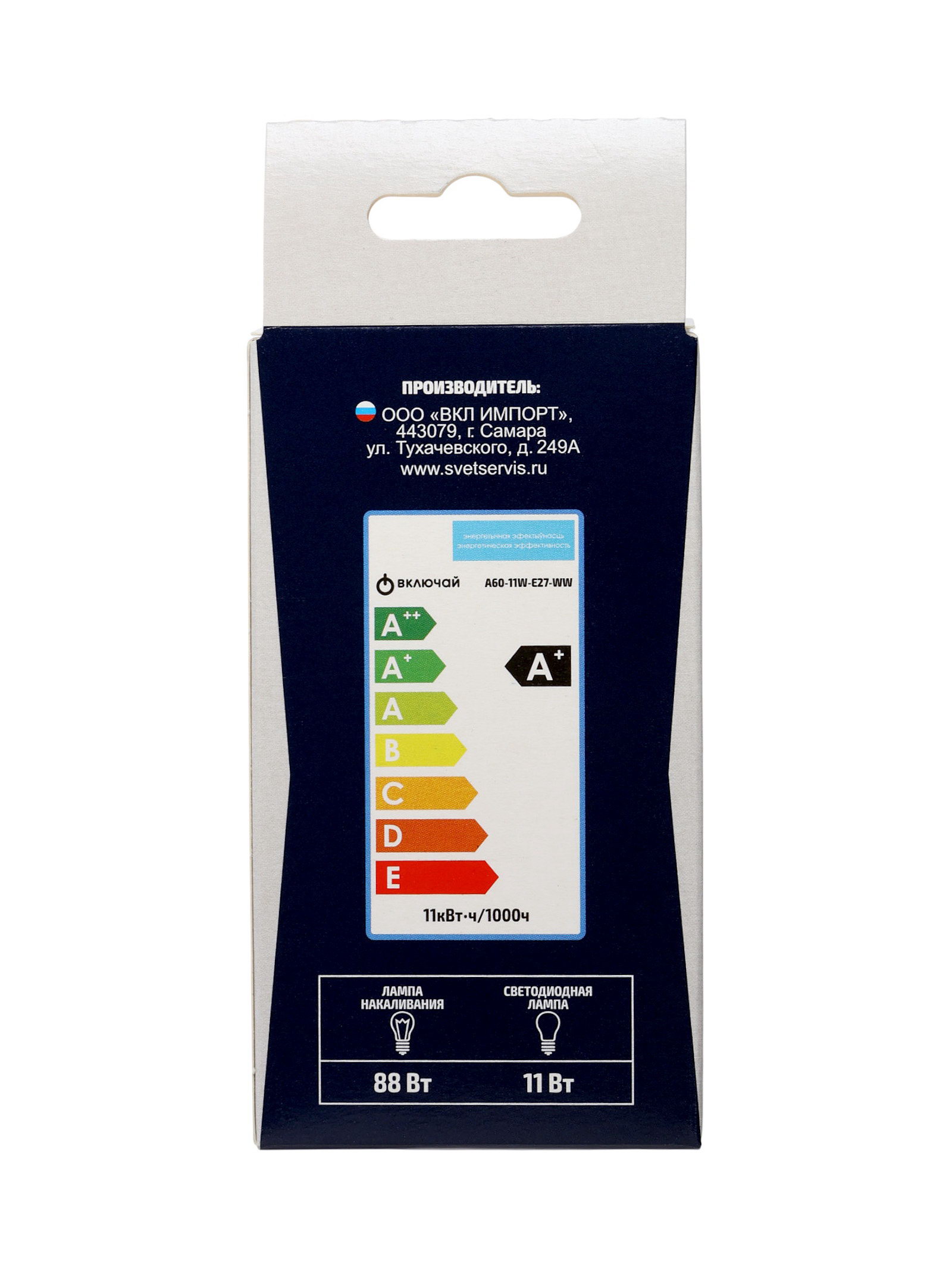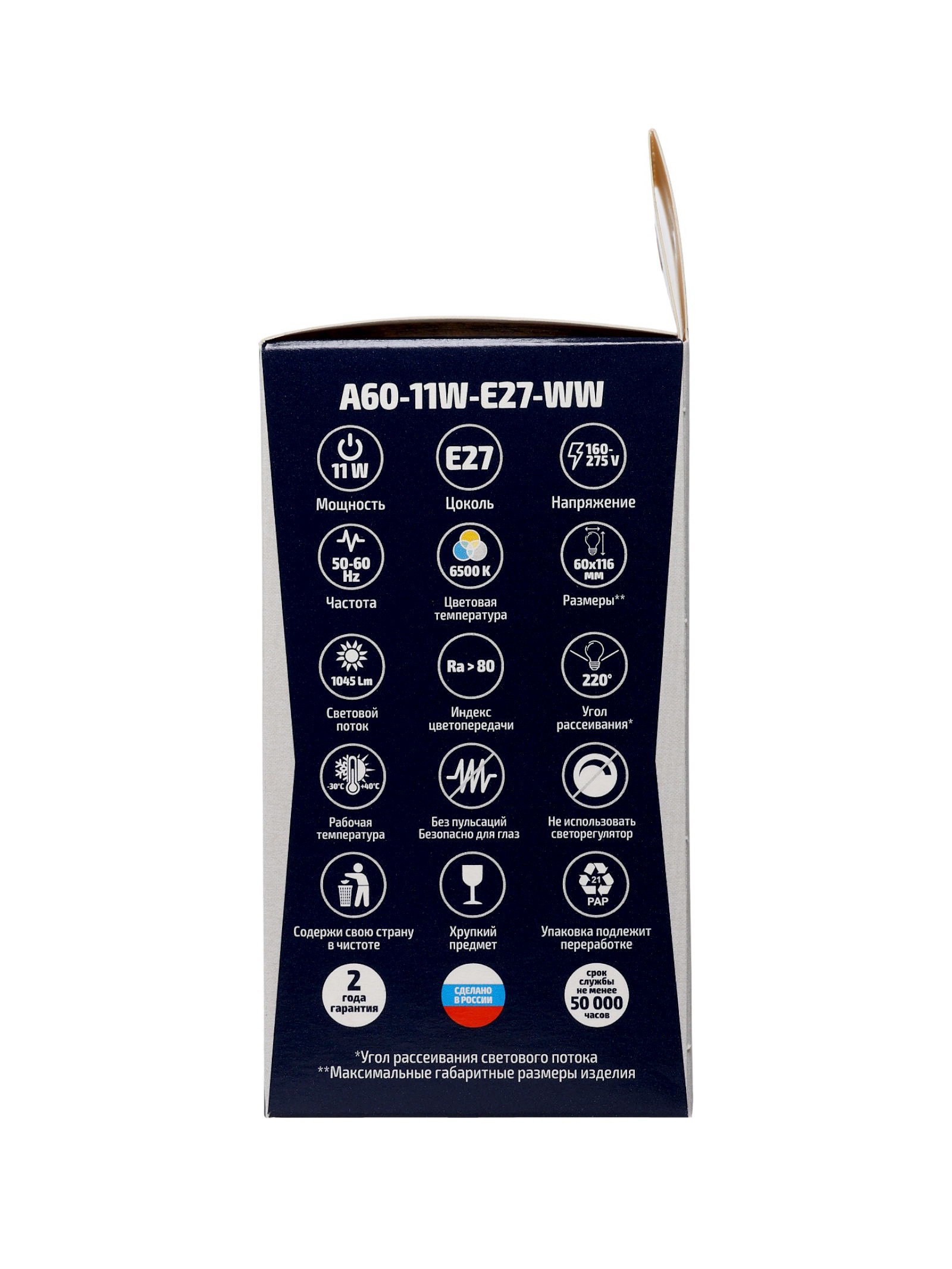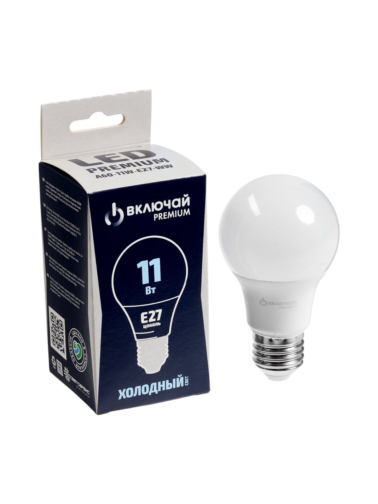 Лампа светодиодная Включай, А60, 11 Вт, E27, 1045 лм, 6500K, IP20, свечение холодное белое, Россия