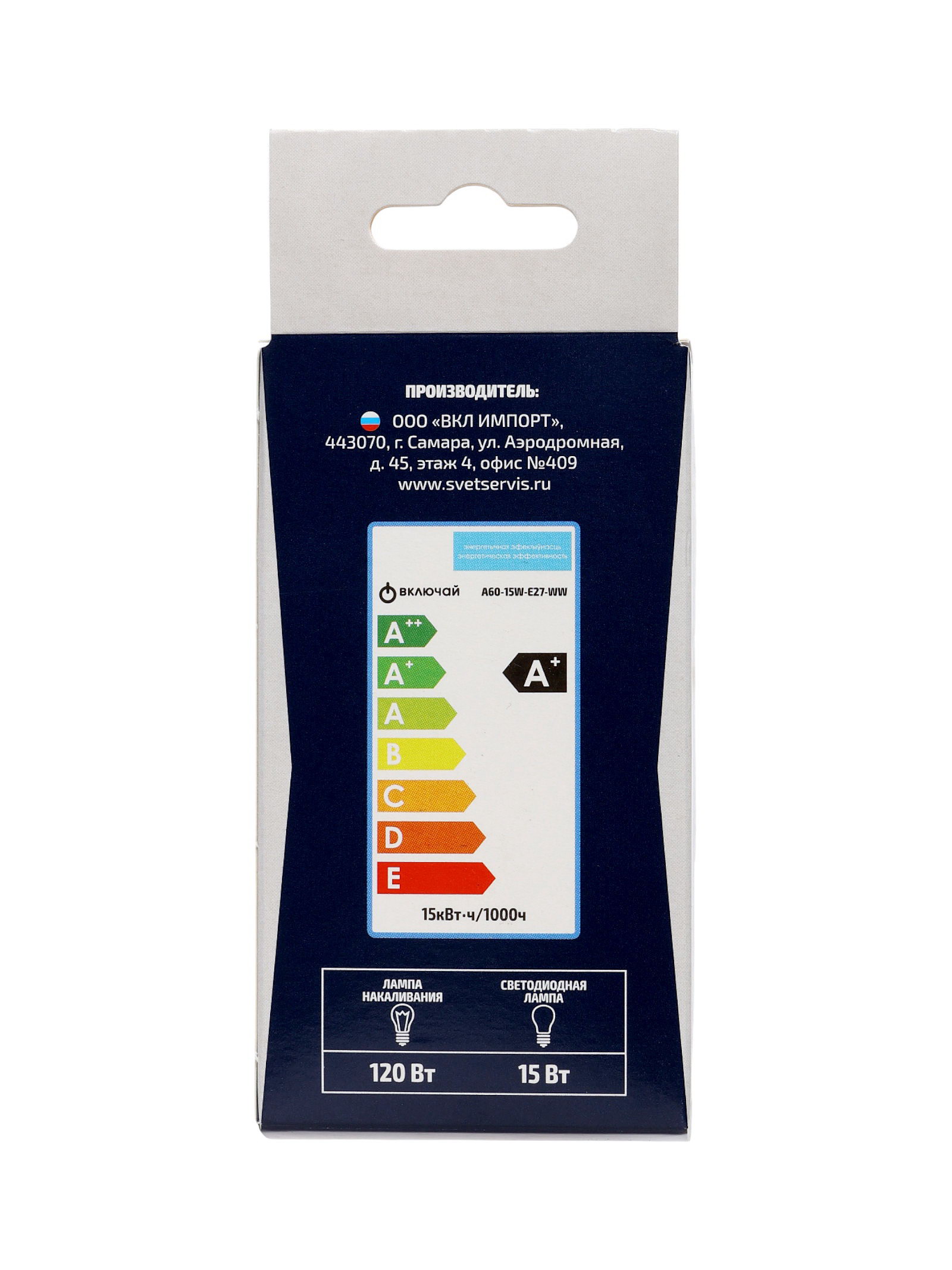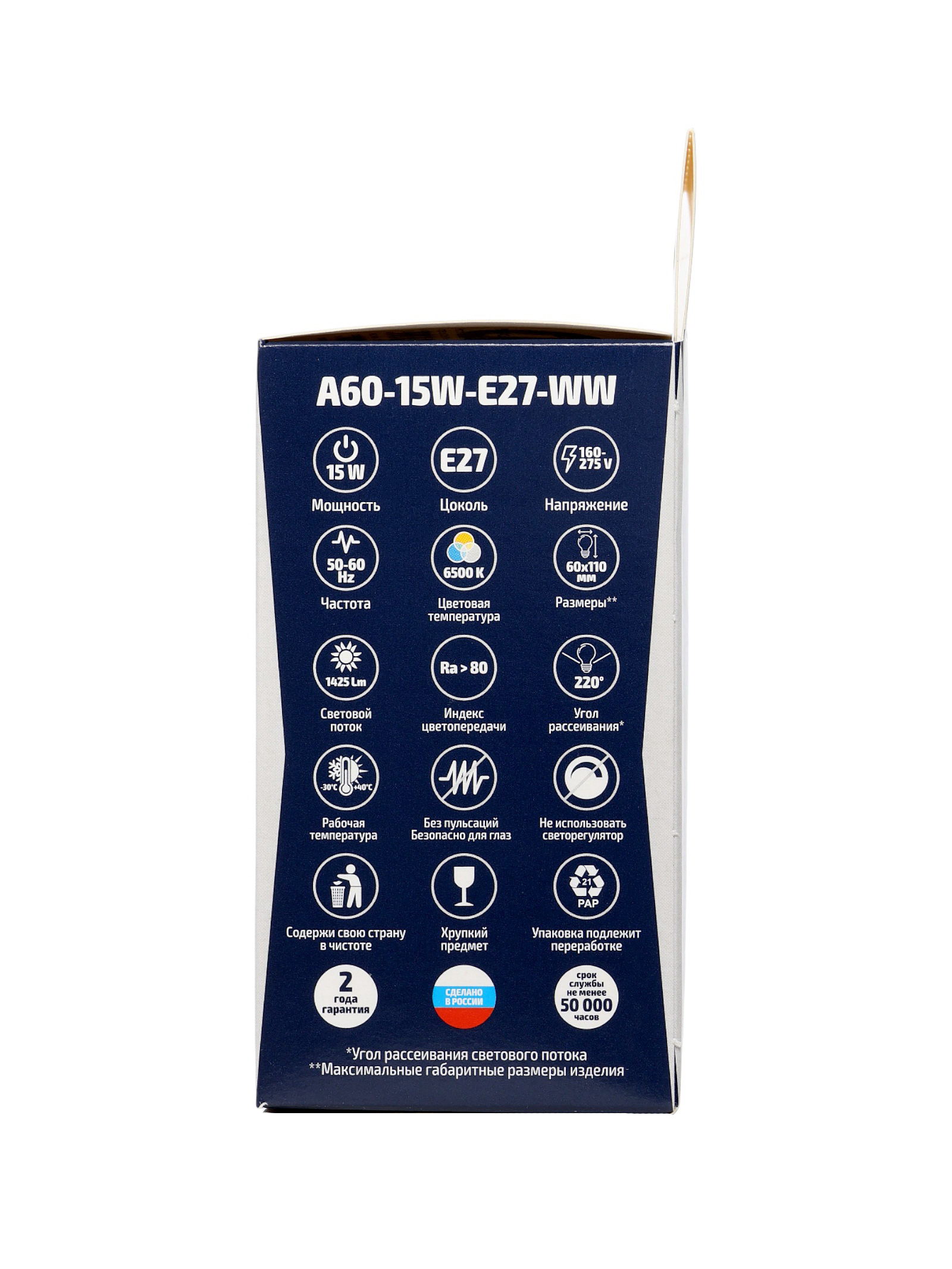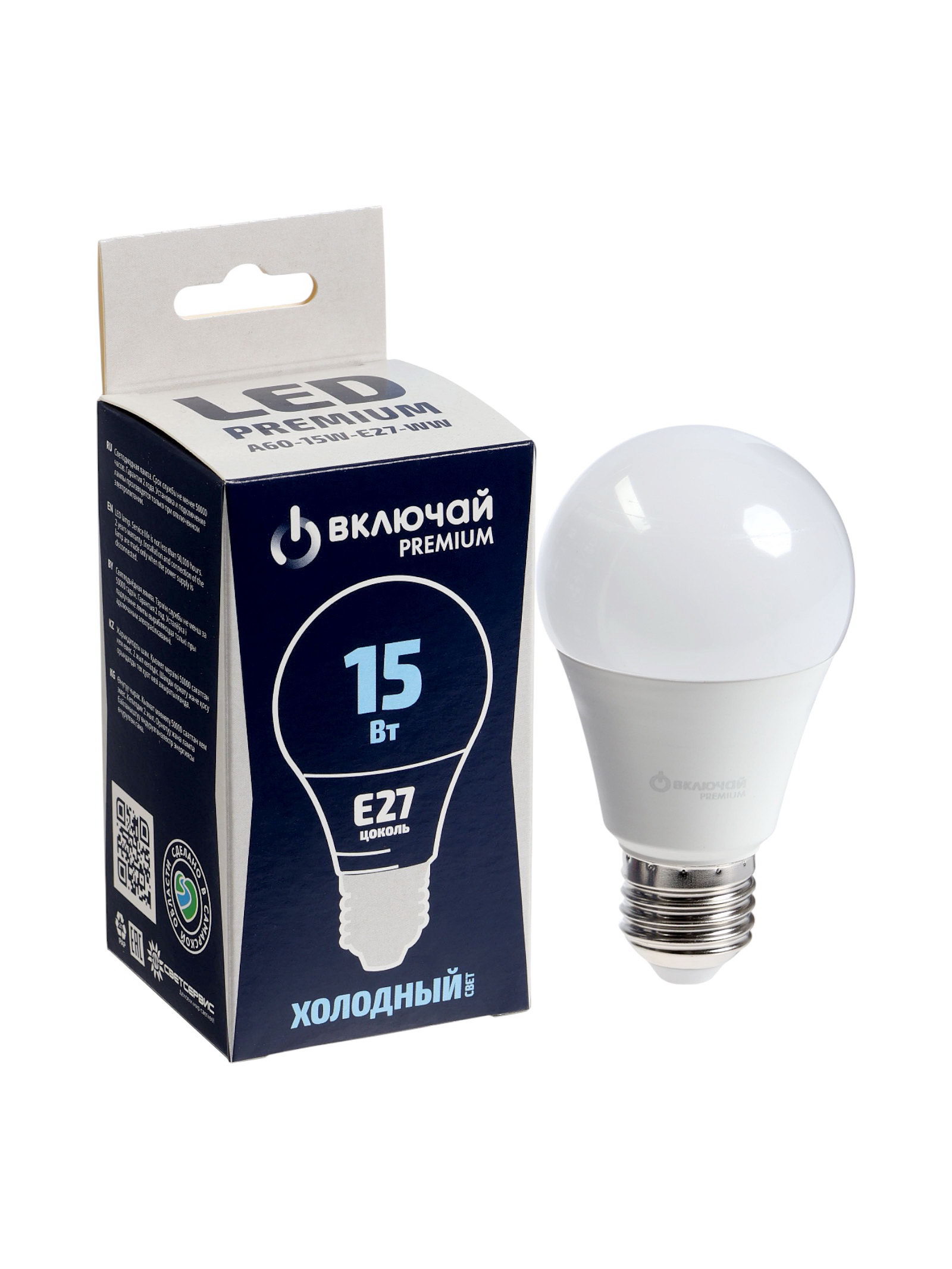 Лампа светодиодная Включай, А60, 15 Вт, E27, 1425 лм, 6500K, IP20, свечение холодное белое, Россия