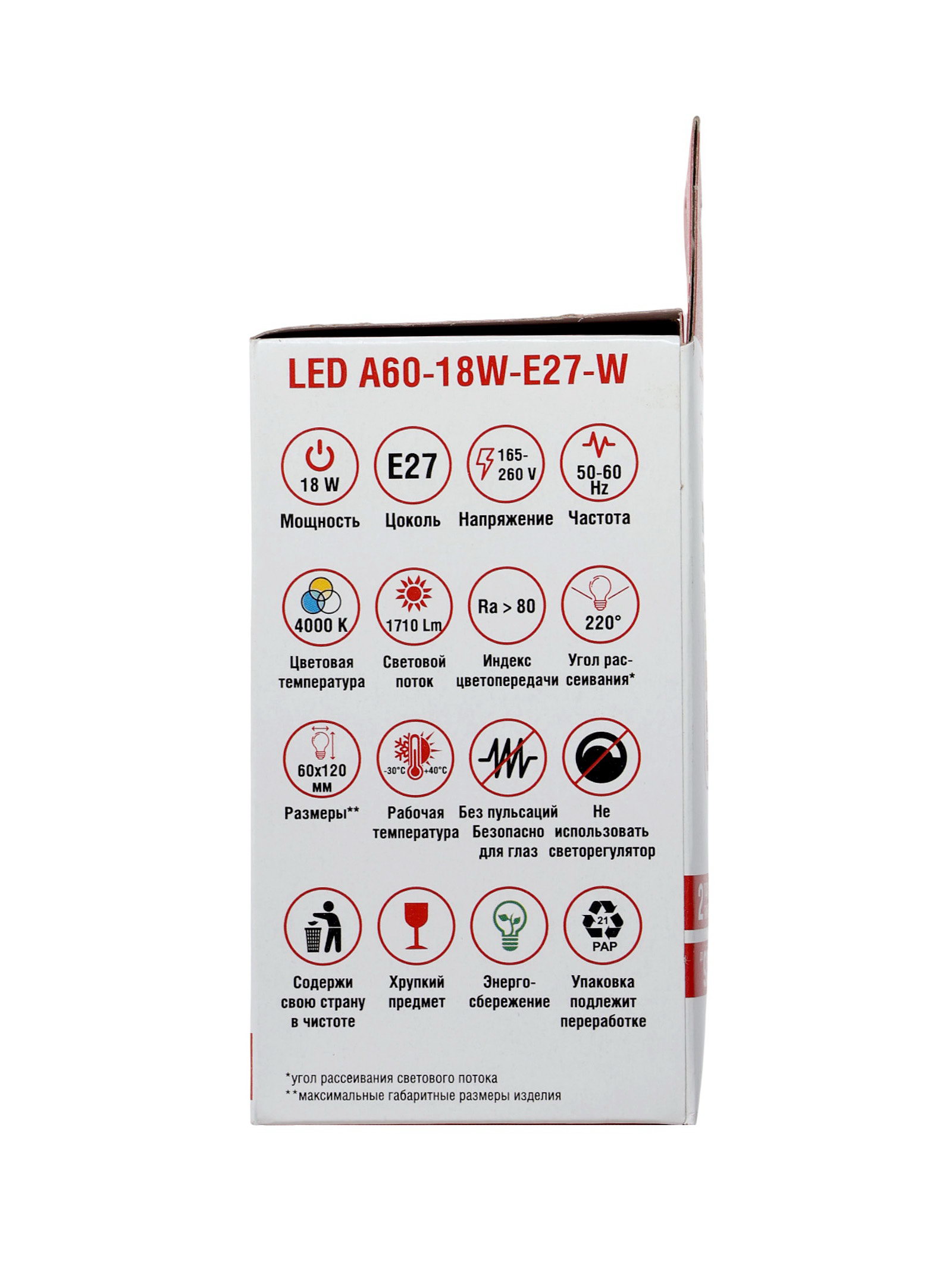 Размер упаковки: 6 x 6 x 14 см. tnved: 8539520000 Гарантийный срок, мес.: 12 Температурное ограничение: Нет Форма лампы: Груша Цветовая температура: 4000К Световой поток, лм: 1710 Мощность, Вт: 18 Цвет свечения: Нейтрально-белый Класс энергоэффективности: A Индекс цветопередачи: RA > 80 Цоколь: E27 Напряжение, В: 220 Диммируемая: Нет | ||