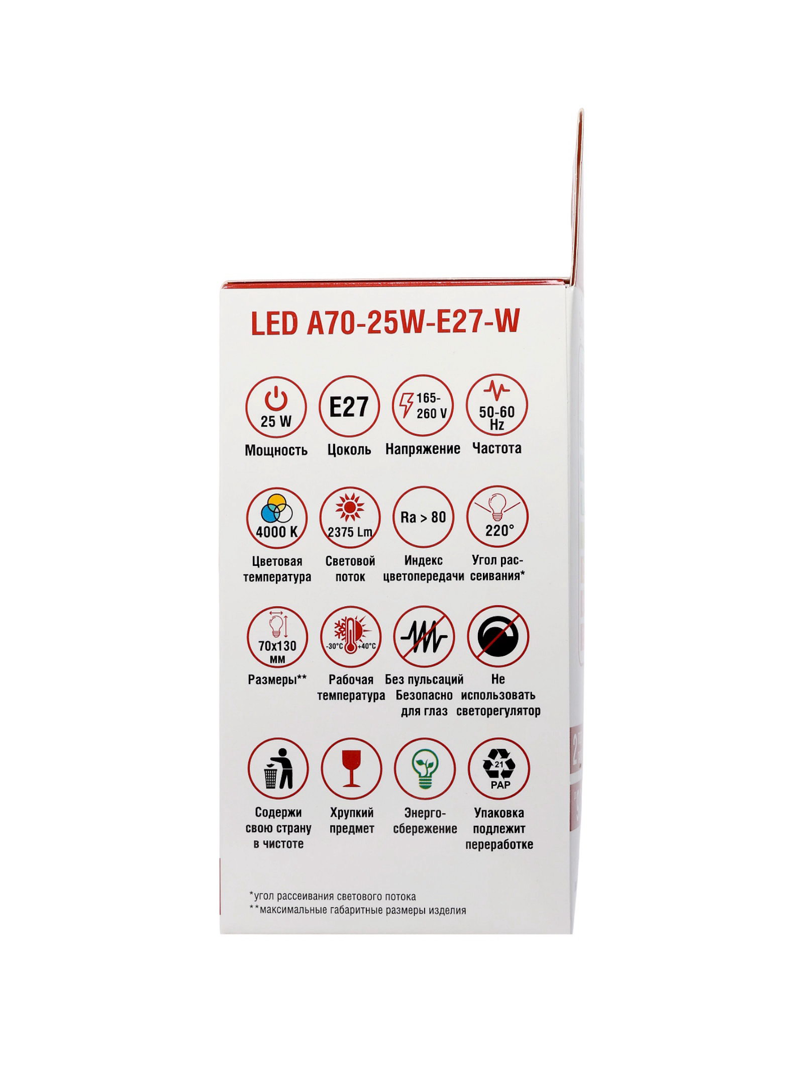 Размер упаковки: 7 x 7 x 16.5 см. tnved: 8539520000 Гарантийный срок, мес.: 12 Температурное ограничение: Нет Цветовая температура: 4000К Форма лампы: Груша Световой поток, лм: 2375 Мощность, Вт: 25 Класс энергоэффективности: A Цвет свечения: Нейтрально-белый Цоколь: E27 Индекс цветопередачи: RA > 80 Напряжение, В: 220 Диммируемая: Нет | ||
