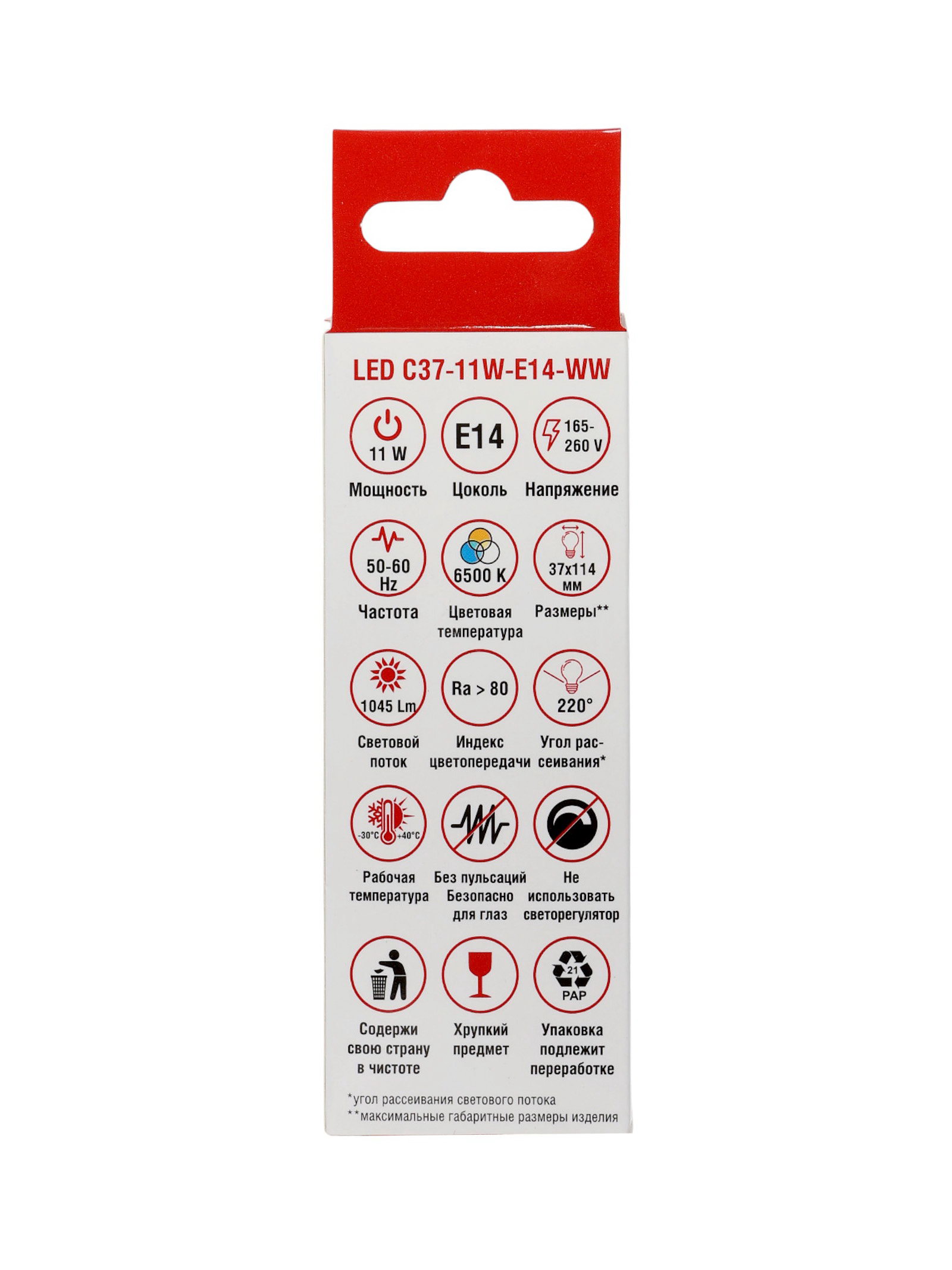 Размер упаковки: 3.7 x 3.5 x 12.5 см. tnved: 8539520000 Гарантийный срок, мес.: 12 Температурное ограничение: Нет Класс энергоэффективности: A Световой поток, лм: 1045 Мощность, Вт: 11 Цвет свечения: Холодный белый Индекс цветопередачи: RA > 80 Цоколь: E14 Напряжение, В: 220 Диммируемая: Нет Форма лампы: Свеча Цветовая температура: 6500К | ||