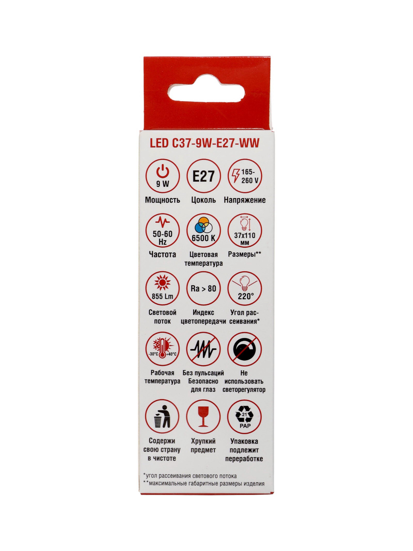 Размер упаковки: 3.7 x 3.5 x 12 см. tnved: 8539520000 Гарантийный срок, мес.: 12 Температурное ограничение: Нет Световой поток, лм: 855 Класс энергоэффективности: A Мощность, Вт: 9 Цвет свечения: Холодный белый Индекс цветопередачи: RA > 80 Цоколь: E27 Напряжение, В: 220 Диммируемая: Нет Цветовая температура: 6500К Форма лампы: Свеча | ||