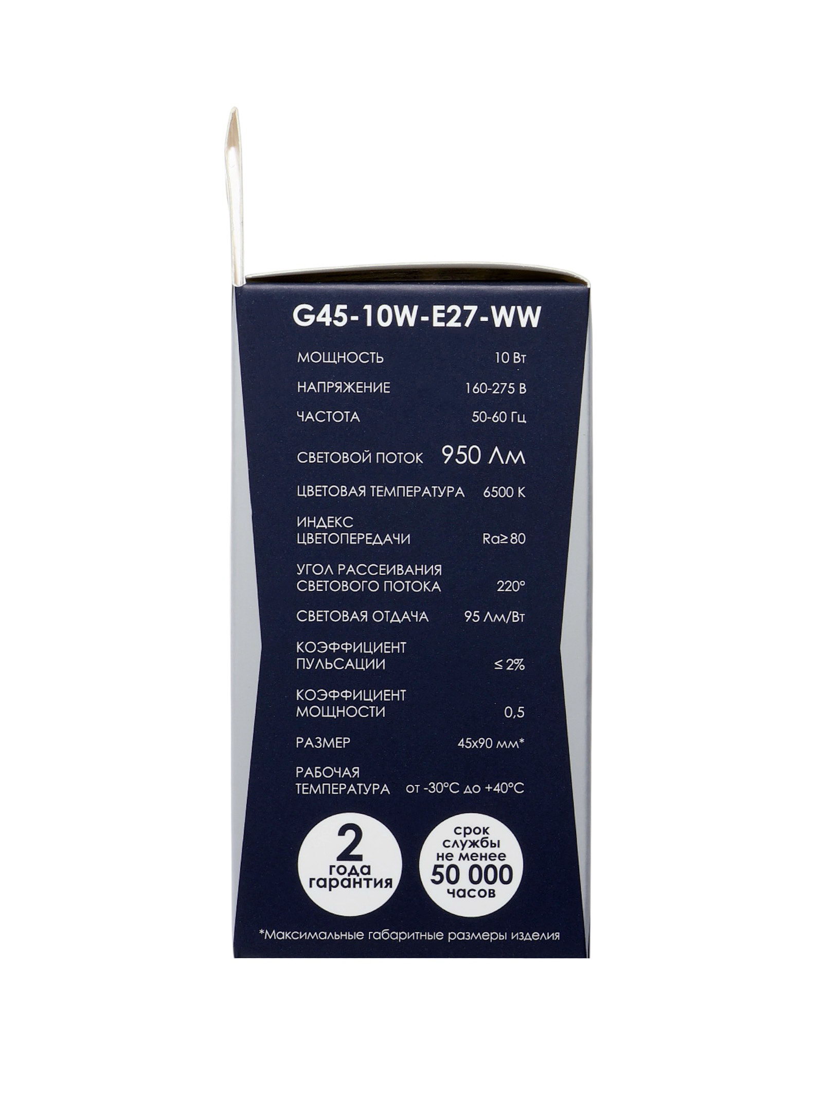 Размер упаковки: 4.7 x 4.7 x 11 см. tnved: 8539520000 Гарантийный срок, мес.: 12 Температурное ограничение: Нет Класс энергоэффективности: A+ Световой поток, лм: 950 Мощность, Вт: 10 Цвет свечения: Холодный белый Цоколь: E27 Индекс цветопередачи: RA > 80 Напряжение, В: 220 Диммируемая: Нет Цветовая температура: 6500К Форма лампы: Шар | ||