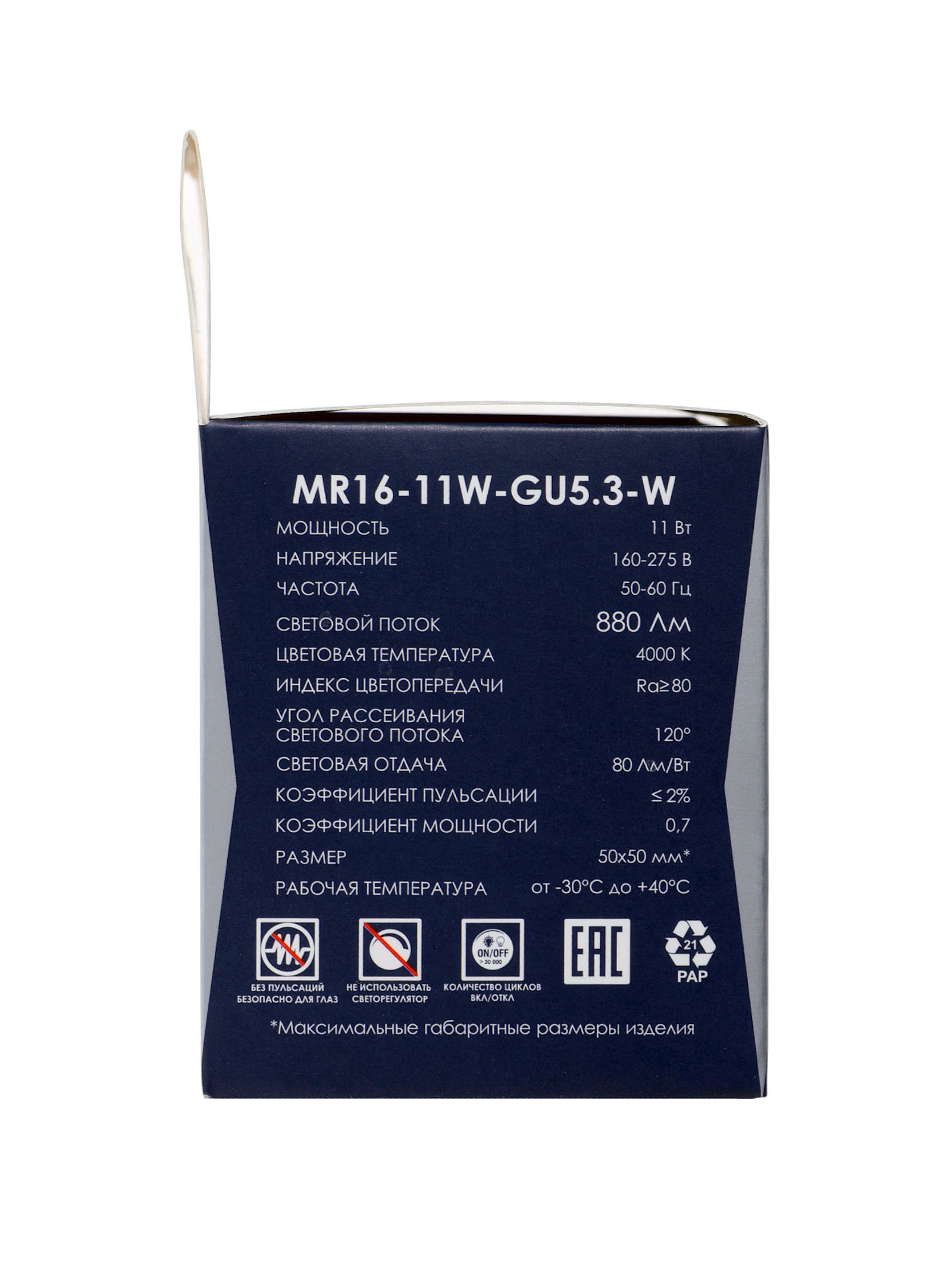 Размер упаковки: 5 x 5 x 8.5 см. tnved: 8539520000 Гарантийный срок, мес.: 12 Температурное ограничение: Нет Цоколь: GU5.3 (G5.3) Класс энергоэффективности: A+ Световой поток, лм: 880 Мощность, Вт: 11 Цвет свечения: Нейтрально-белый Напряжение, В: 220 Индекс цветопередачи: RA > 80 Диммируемая: Нет Форма лампы: Рефлекторная Цветовая температура: 4000К | ||