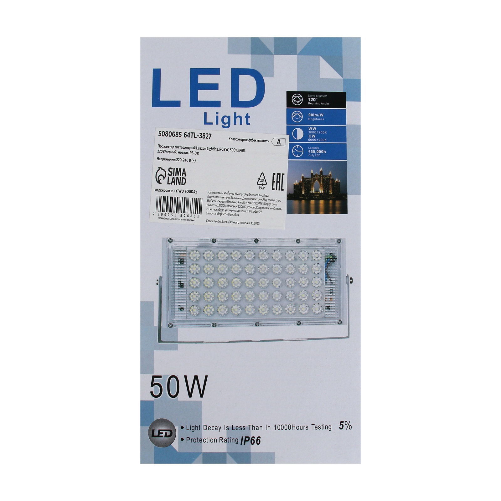 Размер упаковки: 13 x 3.5 x 23 см. Размер упаковки: 13 x 3.5 x 23 см. tnved: 9405420000 Гарантийный срок, мес.: 12 Цвет свечения: RGB Датчик движения: Нет Мощность, Вт: 50 Степень защиты: IP65 Вид лампы: Светодиодная Цоколь: Встроенные LED Световой поток, лм: 4000 Цвет: Чёрный Тип питания: От сети 220 В Освещайте большие пространства и подсвечивайте фасады зданий с помощью светодиодного прожектора. Небольшой вес и компактные размеры позволяют разместить устройство на рекламных щитах, выставочных стендах, в складских помещениях, в гараже, в подвале. Используйте светильник на улице и освещайте двор, теплицу, парковку и подъезд благодаря надёжной защите от воды и пыли. Высокая энергоэффективность светодиодов и долгий срок службы экономят бюджет и обеспечивают круглогодичную бесперебойную работу. | ||