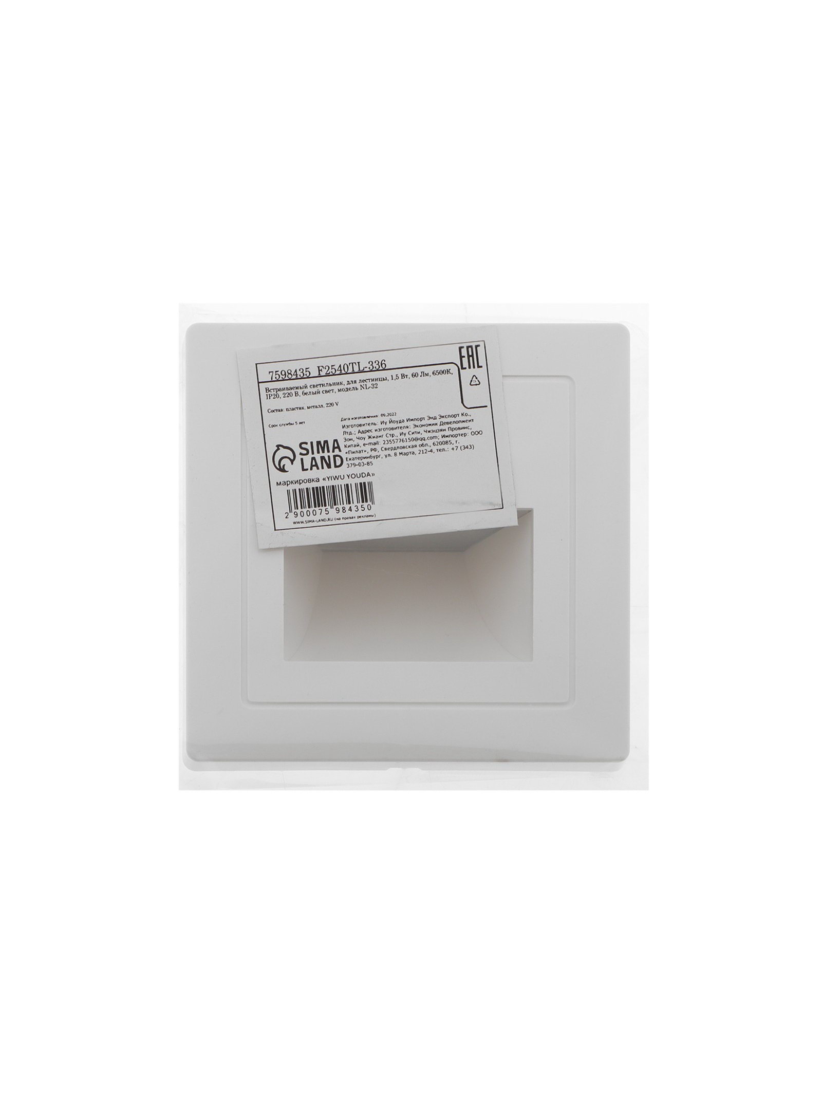 Встраиваемый светильник для лестницы, 1.5 Вт, 60 Лм, 6500К, 86x86 мм, IP20, 220 В, белый, свечение холодное белое, 8.5x8.5x3.5 см., Китай