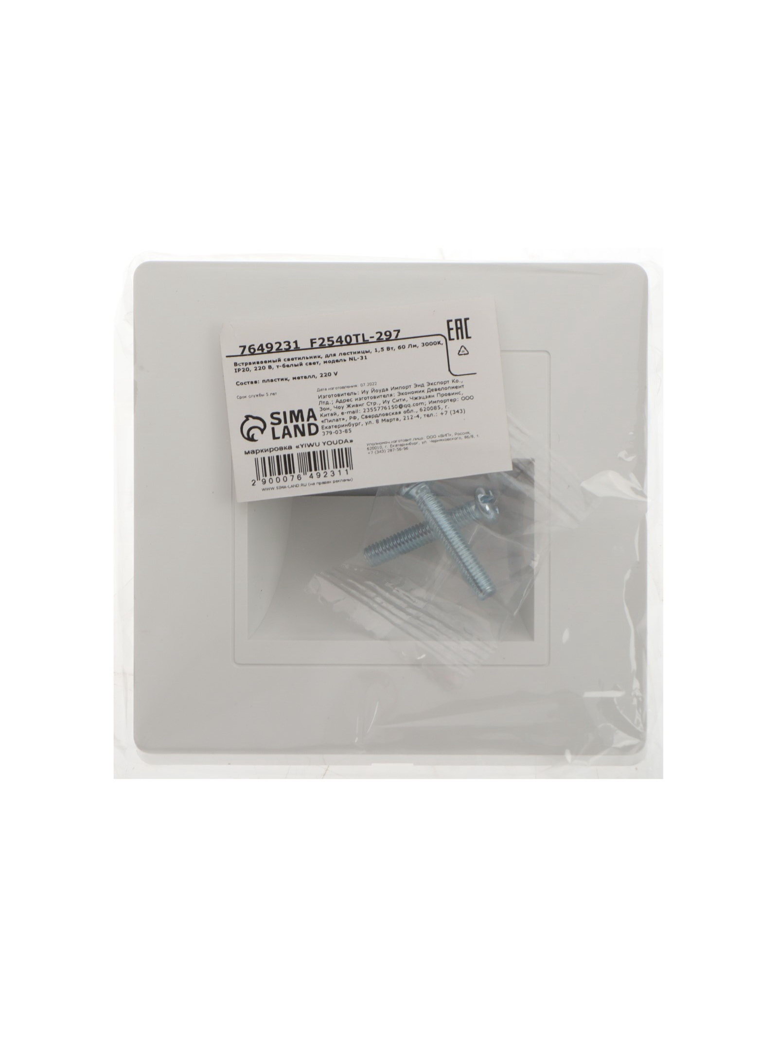 Встраиваемый светильник для лестницы, 1.5 Вт, 60 Лм, 3000К, 86x86 мм, IP20, 220 В, белый, свечение тёплое белое, 8.5x8.5x3.5 см., Китай