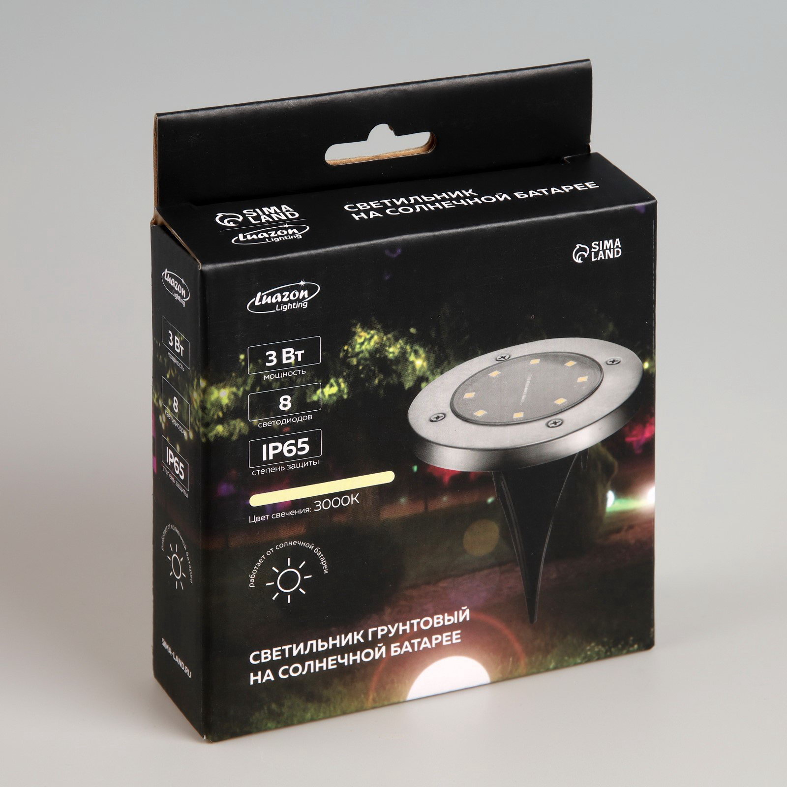 Садовый светильник, уличный, на солнечной батарее, 8 LED, свечение тёплое белое, 11.5x11.5x3 см., Luazon Lighting, Китай