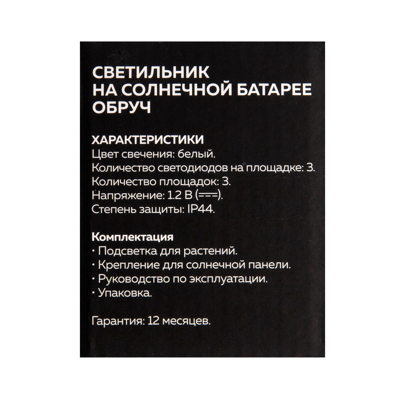 Размер упаковки: 8 x 10 x 15.5 см. Размер упаковки: 8 x 10 x 15.5 см. tnved: 9405410000 Цвет свечения: Мульти Гарантийный срок, мес.: 6 Температурный режим: От -10 до +35 ℃ Цвет корпуса: Чёрный Количество ламп: 9 Цоколь: Встроенные LED Степень защиты: IP44 Материал основания: Пластик | ||